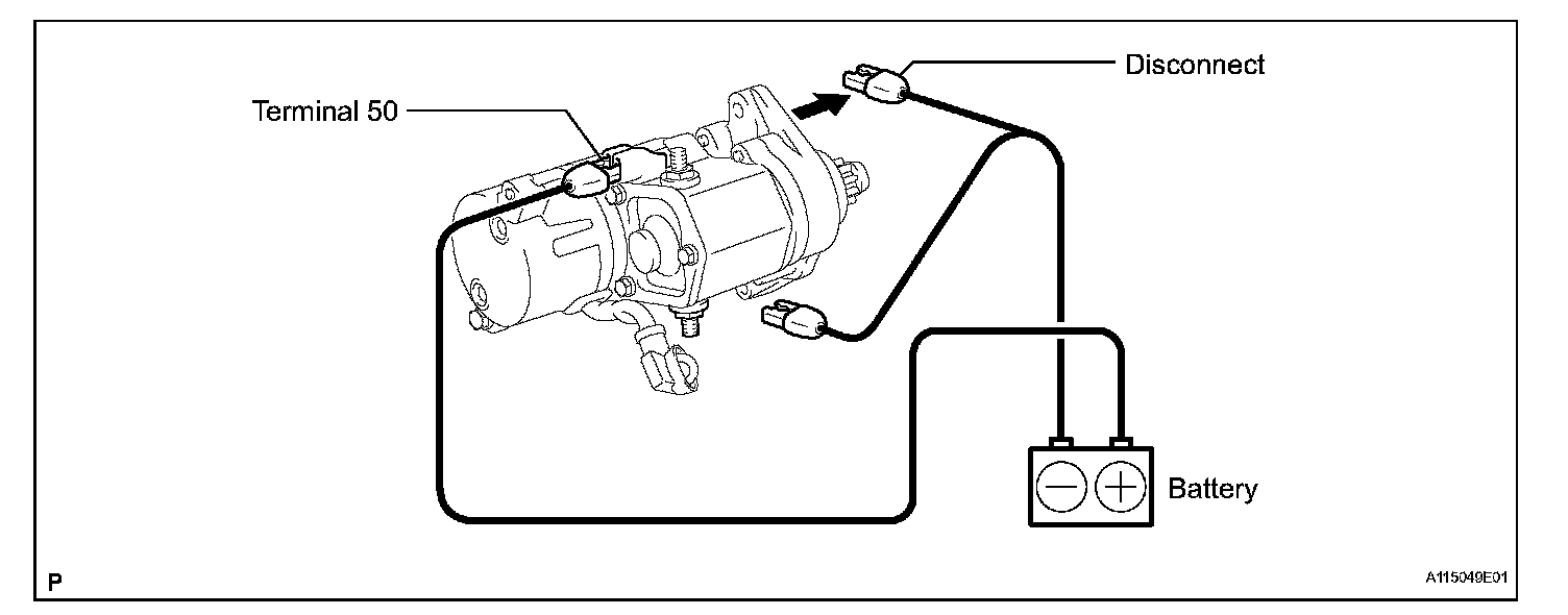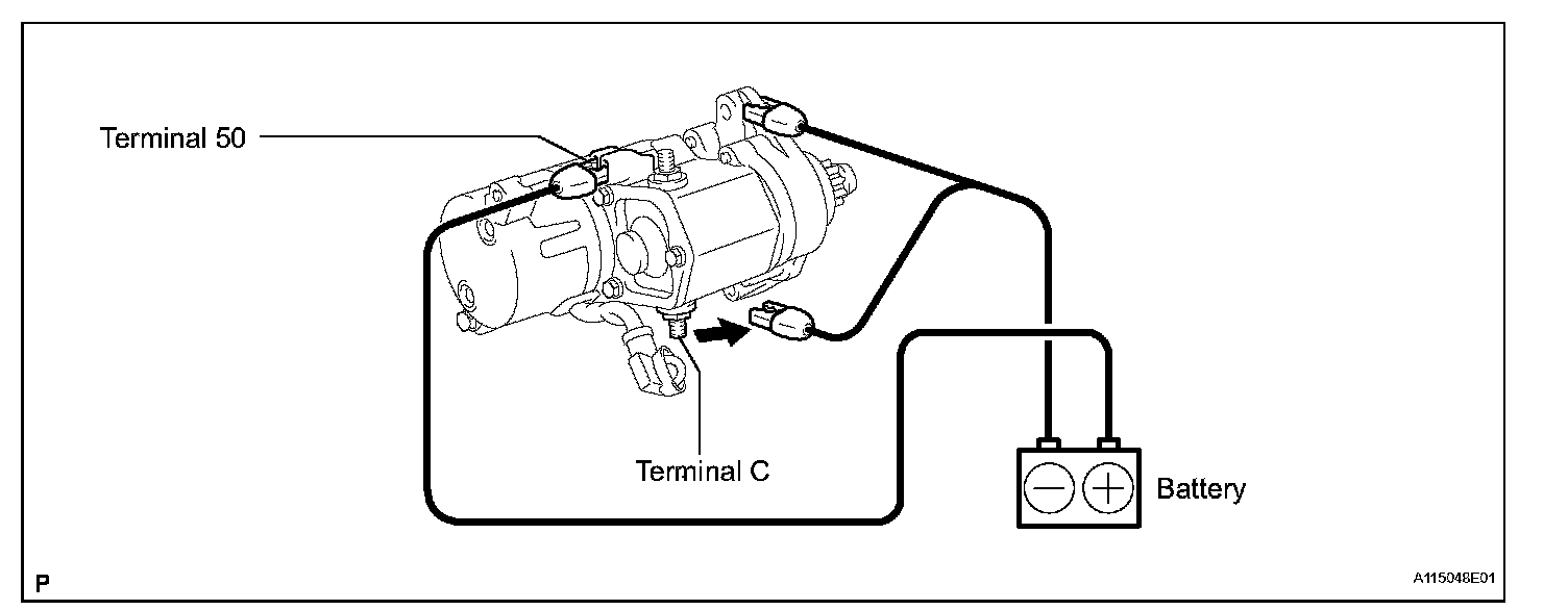 3. Disconnect the negative (-) lead from terminal C. Check that the pinion gear remains out.
