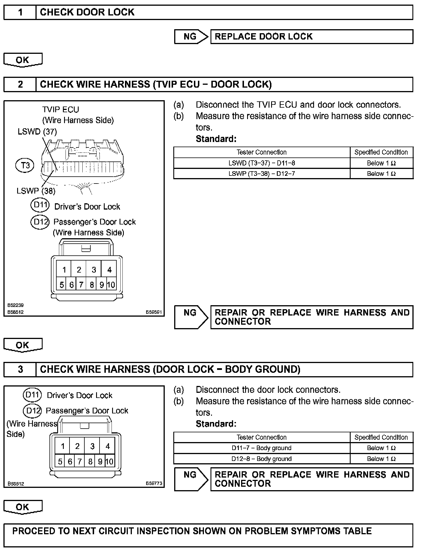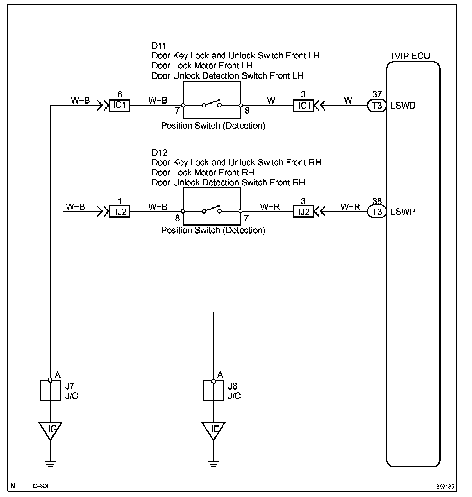 DOOR UNLOCK DETECTION SWITCH CIRCUITCIRCUIT DESCRIPTIONThe door unlock detection switch is built into the door lock motor assembly. This switch is ON when the door lock knob is in the unlock position and OFF when the knob is in the lock position. The ECU detects the door lock knob conditions in this circuit.