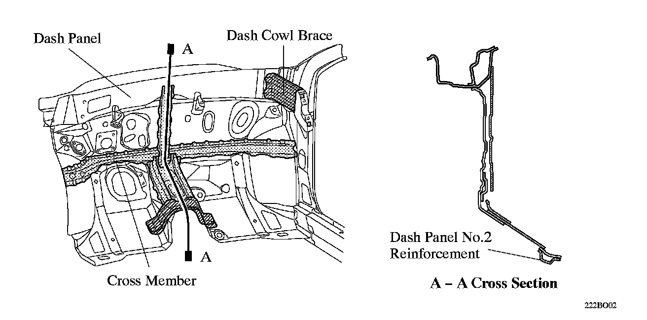 ^ cross member and a dash cowl brace have been placed in the dash panel to reduce the vibration of the dash panel. Furthermore, a dash panel No. 2 reinforcement has been placed at the bottom of the floor tunnel to reduce the vibration of the front floor.