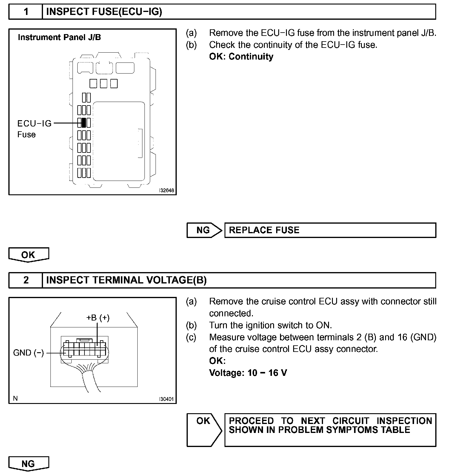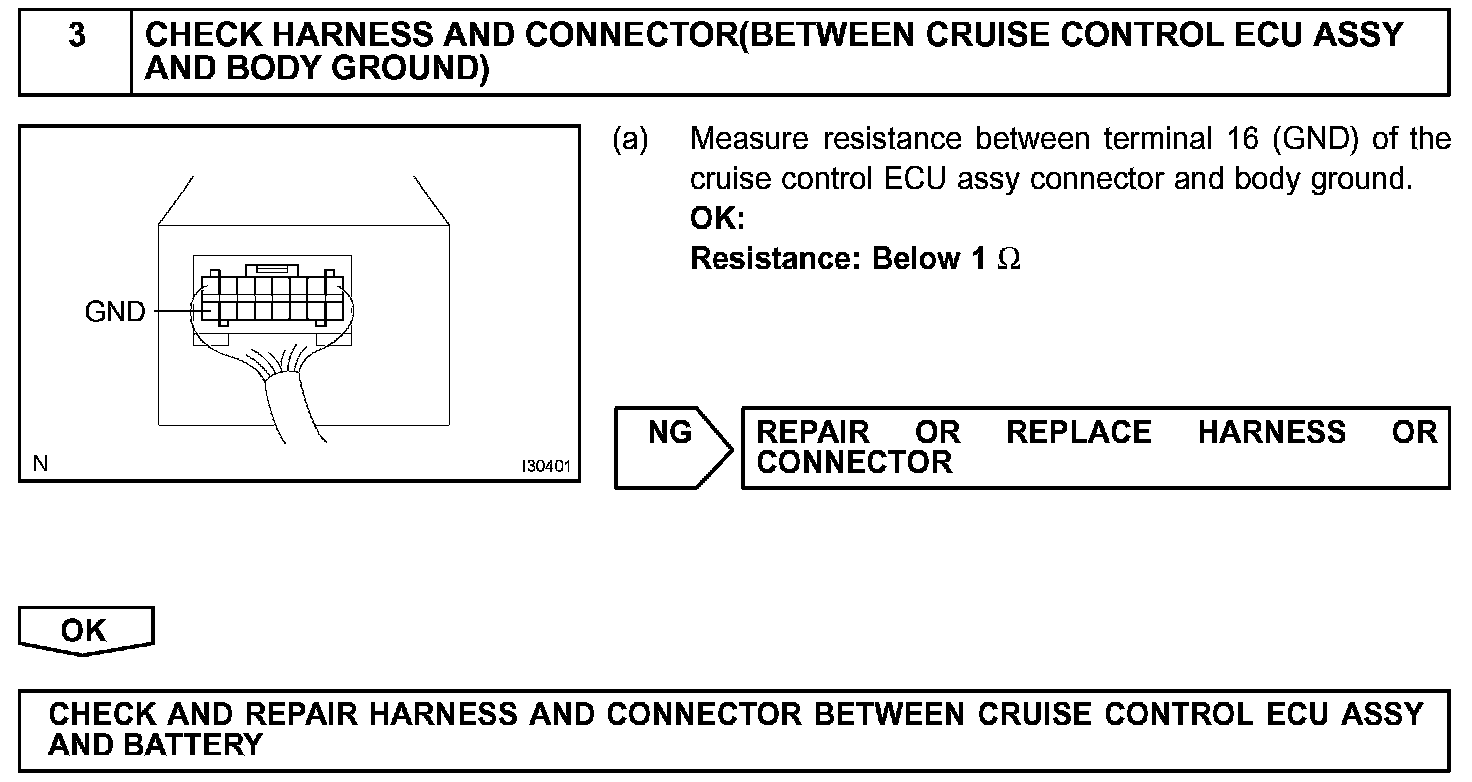 The cruise control ECU assembly power source supplies power to the actuator and sensors, etc., when terminal GND and the case of the cruise control ECU assembly are grounded.