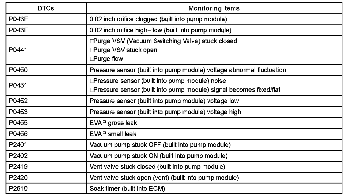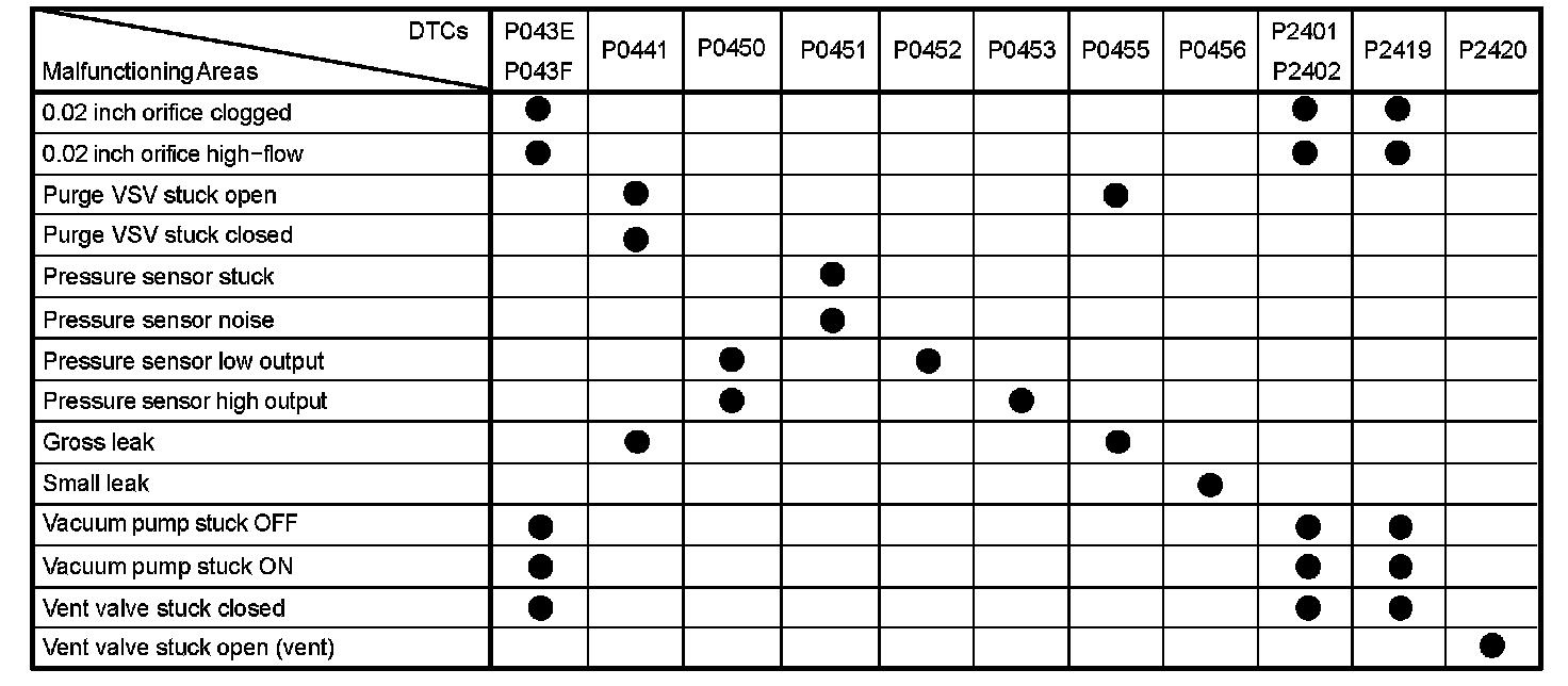 If any EVAP system DTCs are set, the malfunctioning area can be determined using the table given.