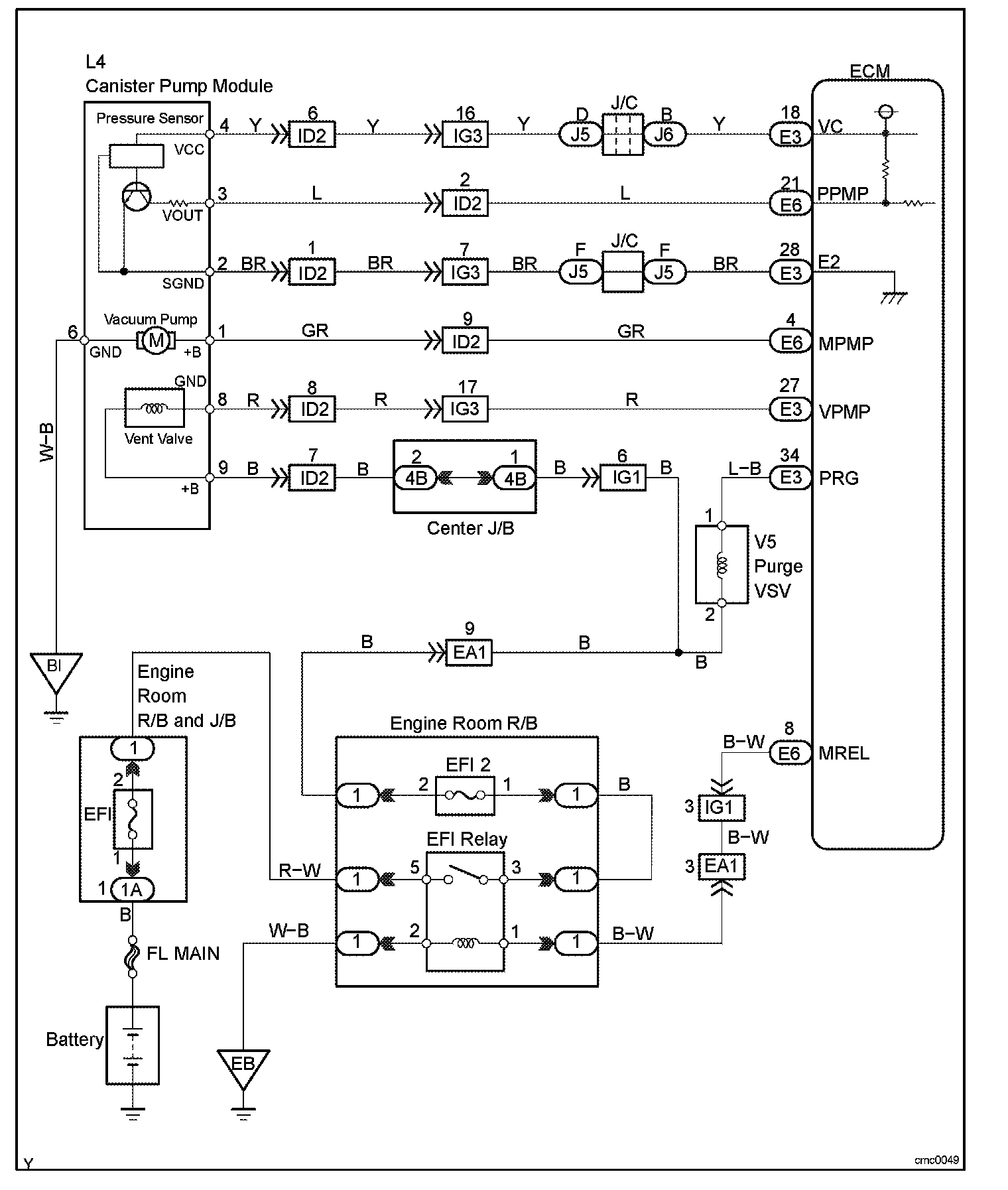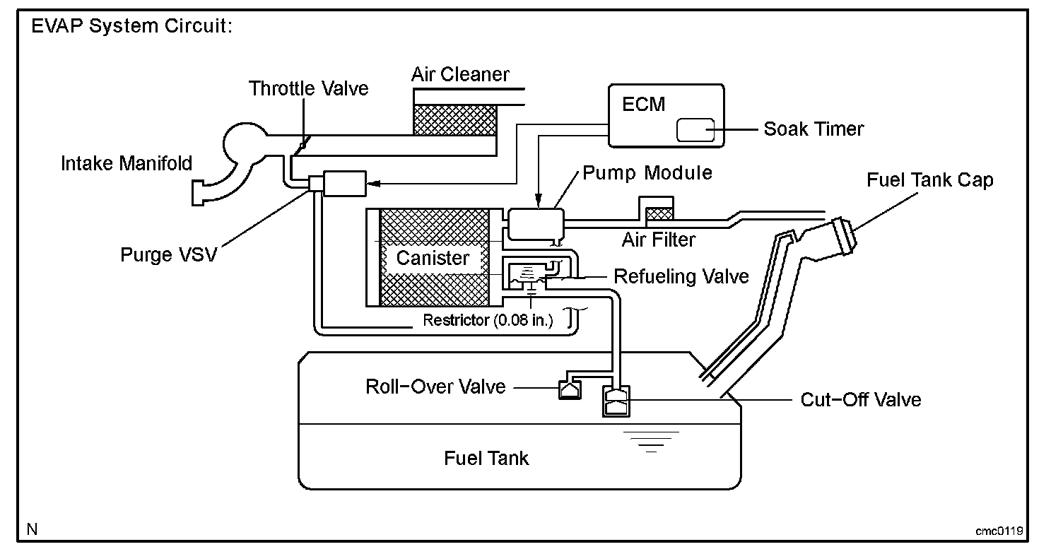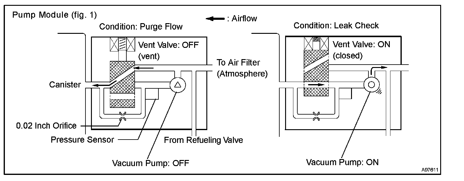The electric vacuum pump creates negative pressure (vacuum) in the EVAP system and the pressure is measured. Finally, the ECM monitors for leaks from the EVAP system, and malfunctions in both the pump module and purge VSV, based on the EVAP pressure.