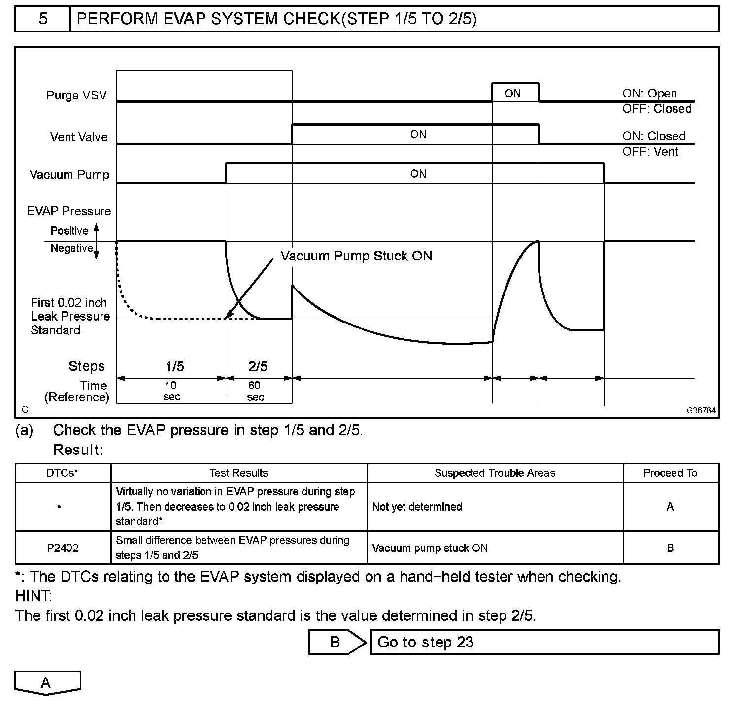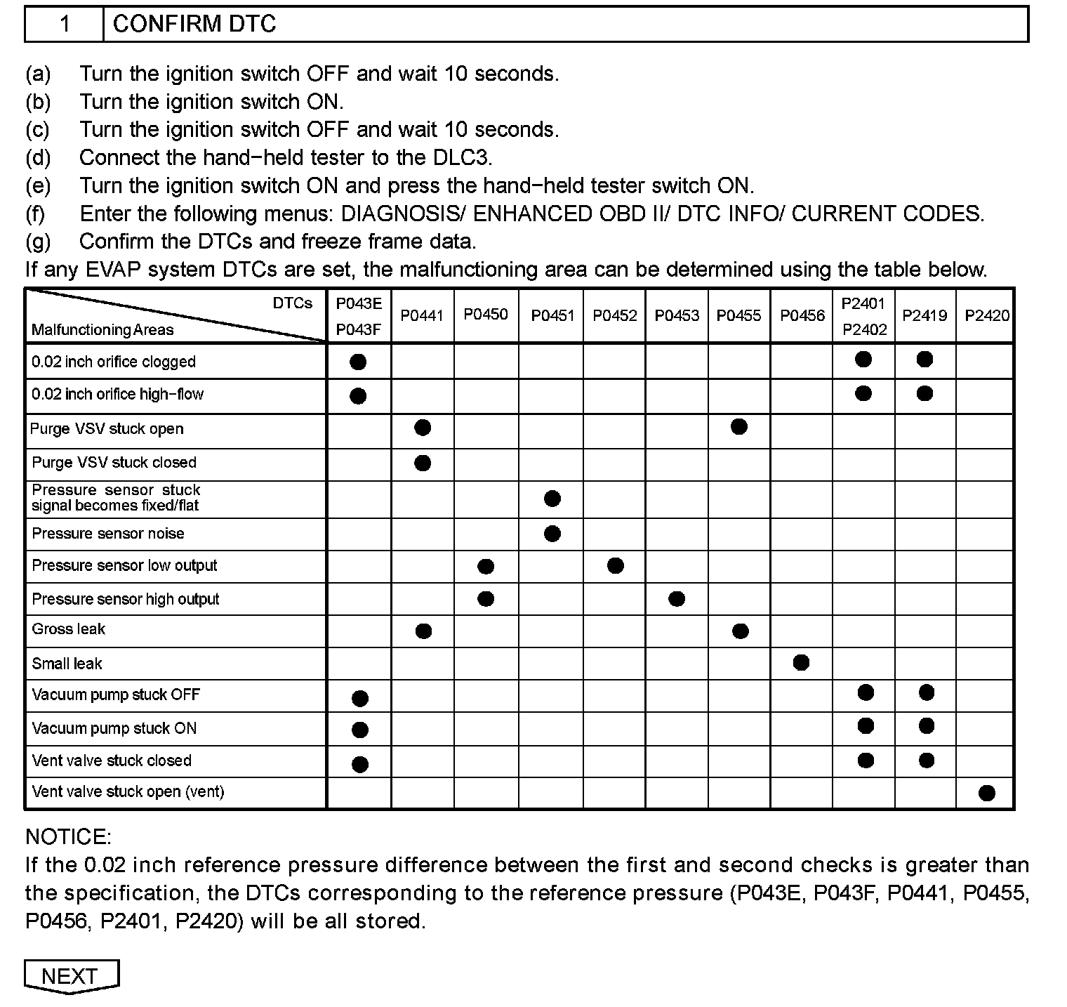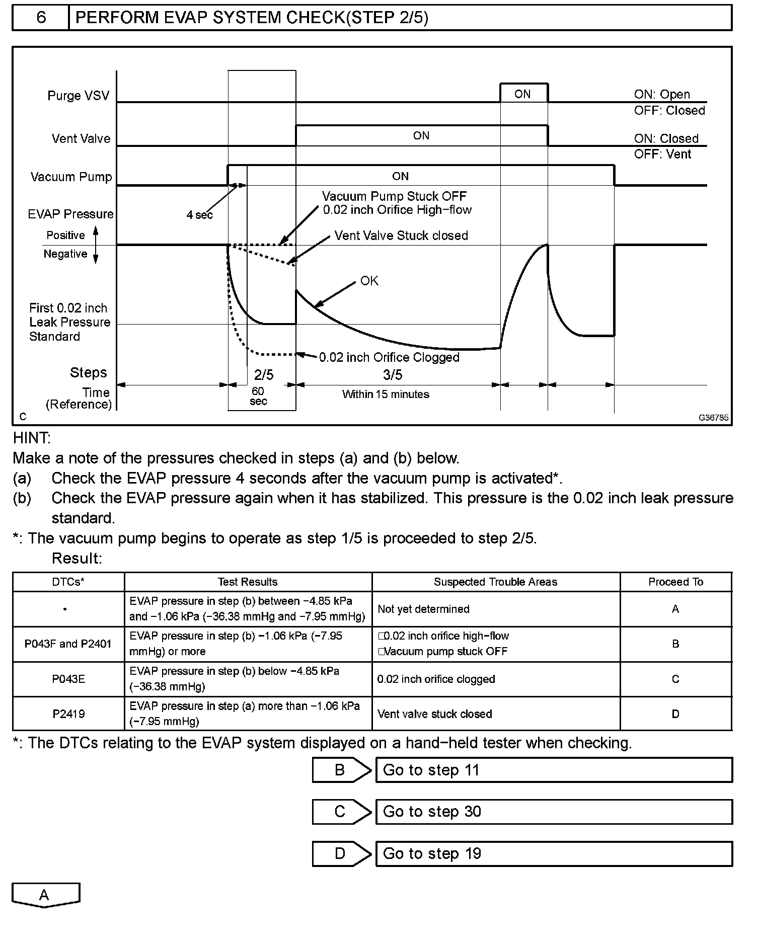 NOTE: If the 0.02 inch reference pressure difference between the first and second checks is greater than the specification, the DTCs corresponding to the reference pressure (P043E, P043F, P0441, P0455, P0456, P2401, P2420) will be all stored.