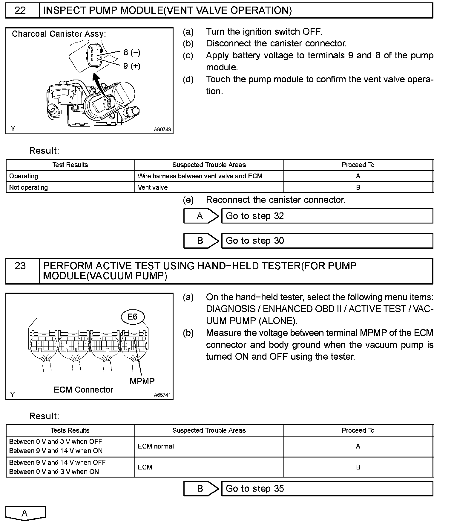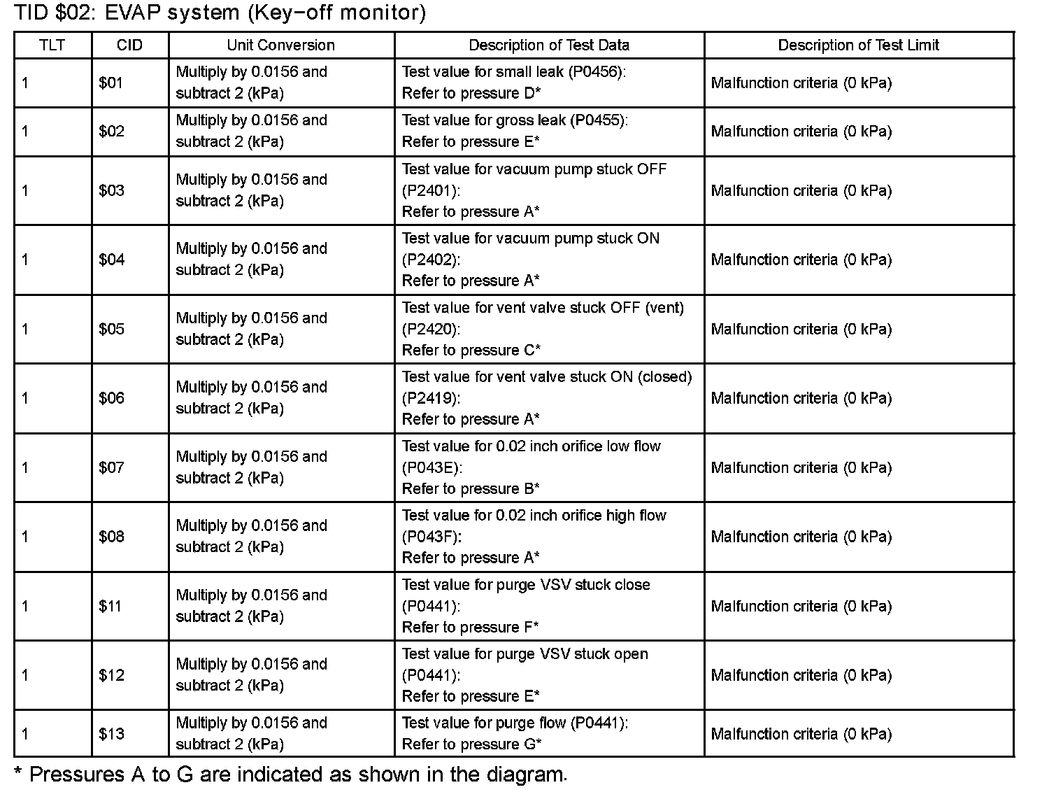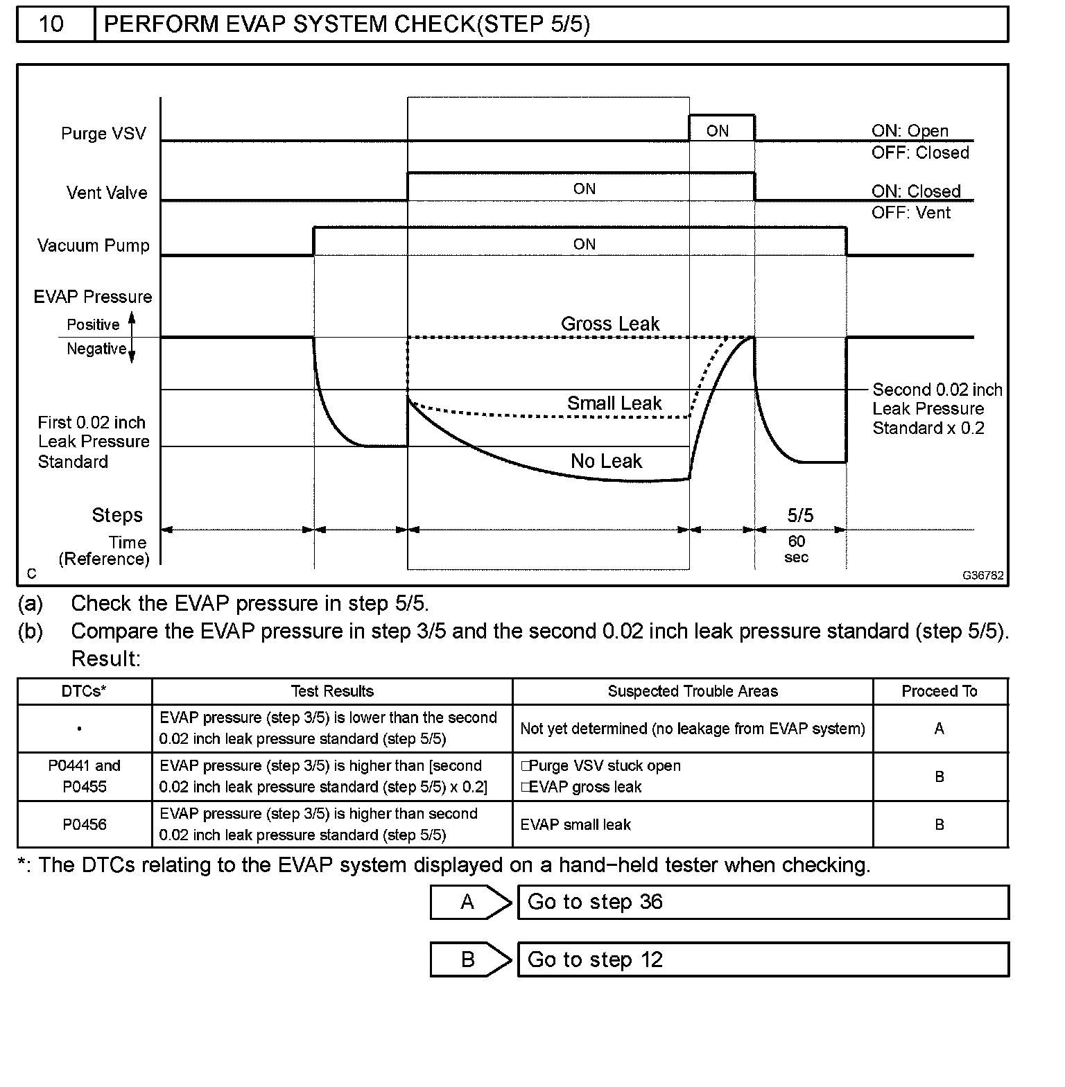 NOTE: If the 0.02 inch reference pressure difference between the first and second checks is greater than the specification, the DTCs corresponding to the reference pressure (P043E, P043F, P0441, P0455, P0456, P2401, P2420) will be all stored.