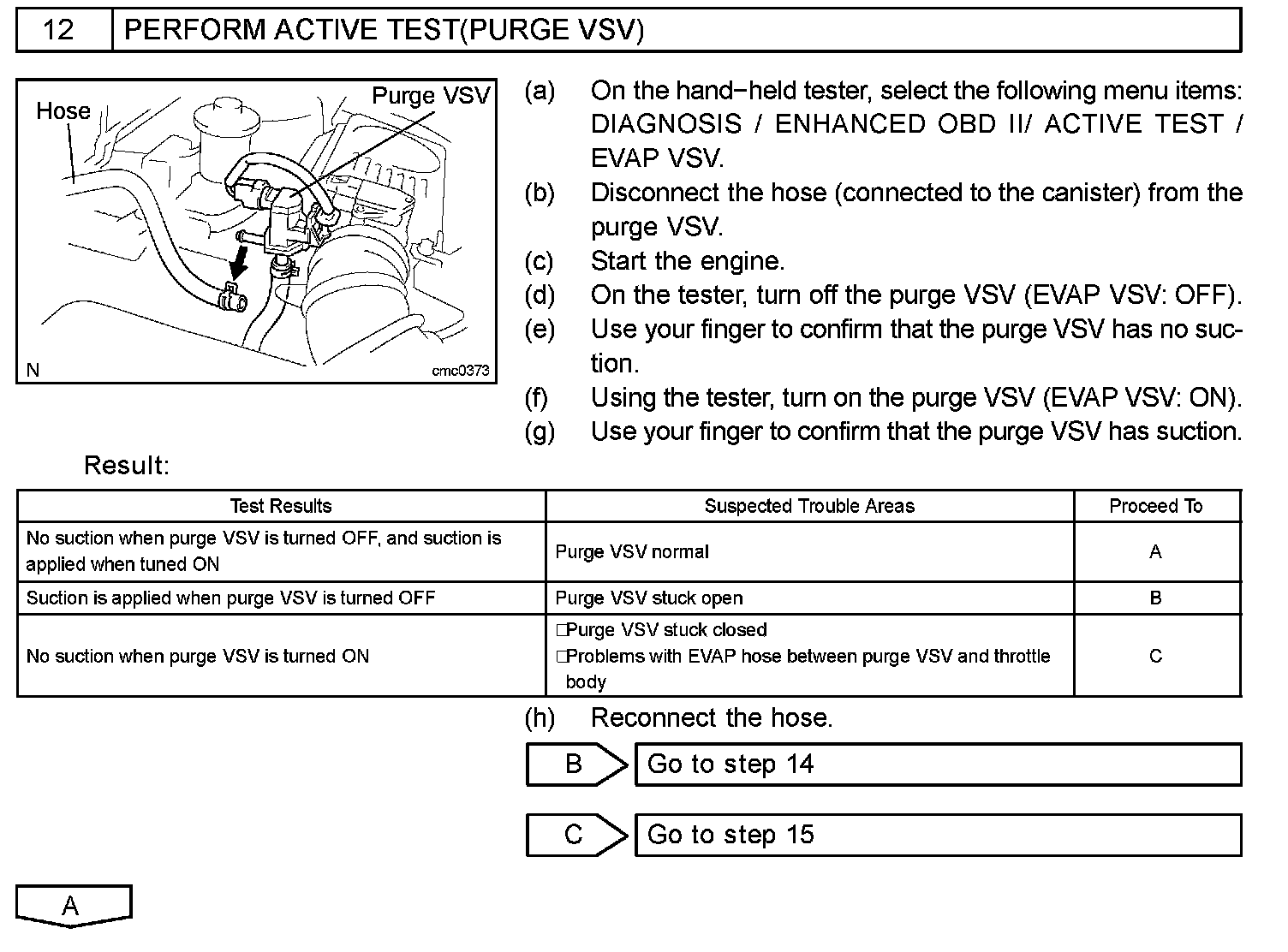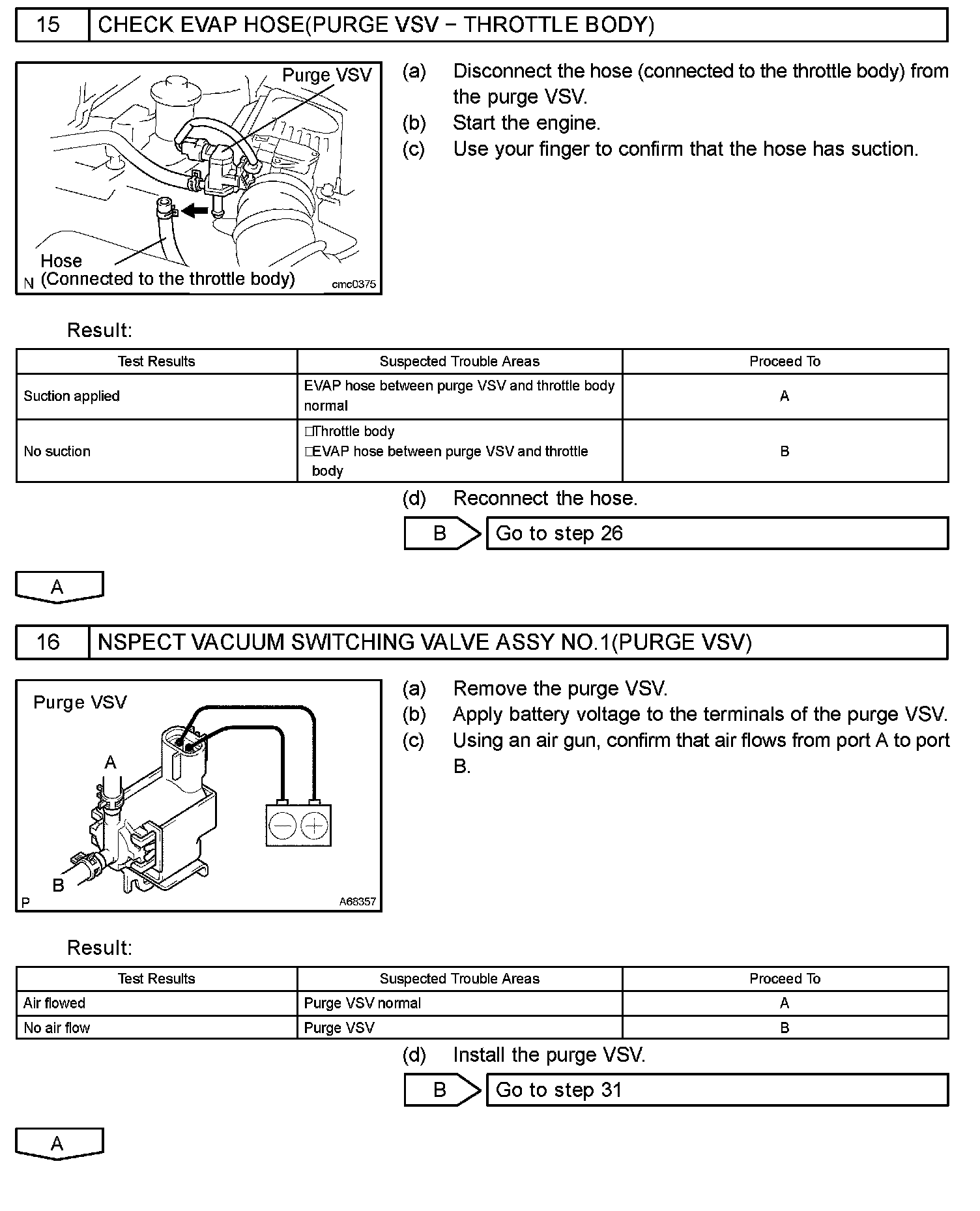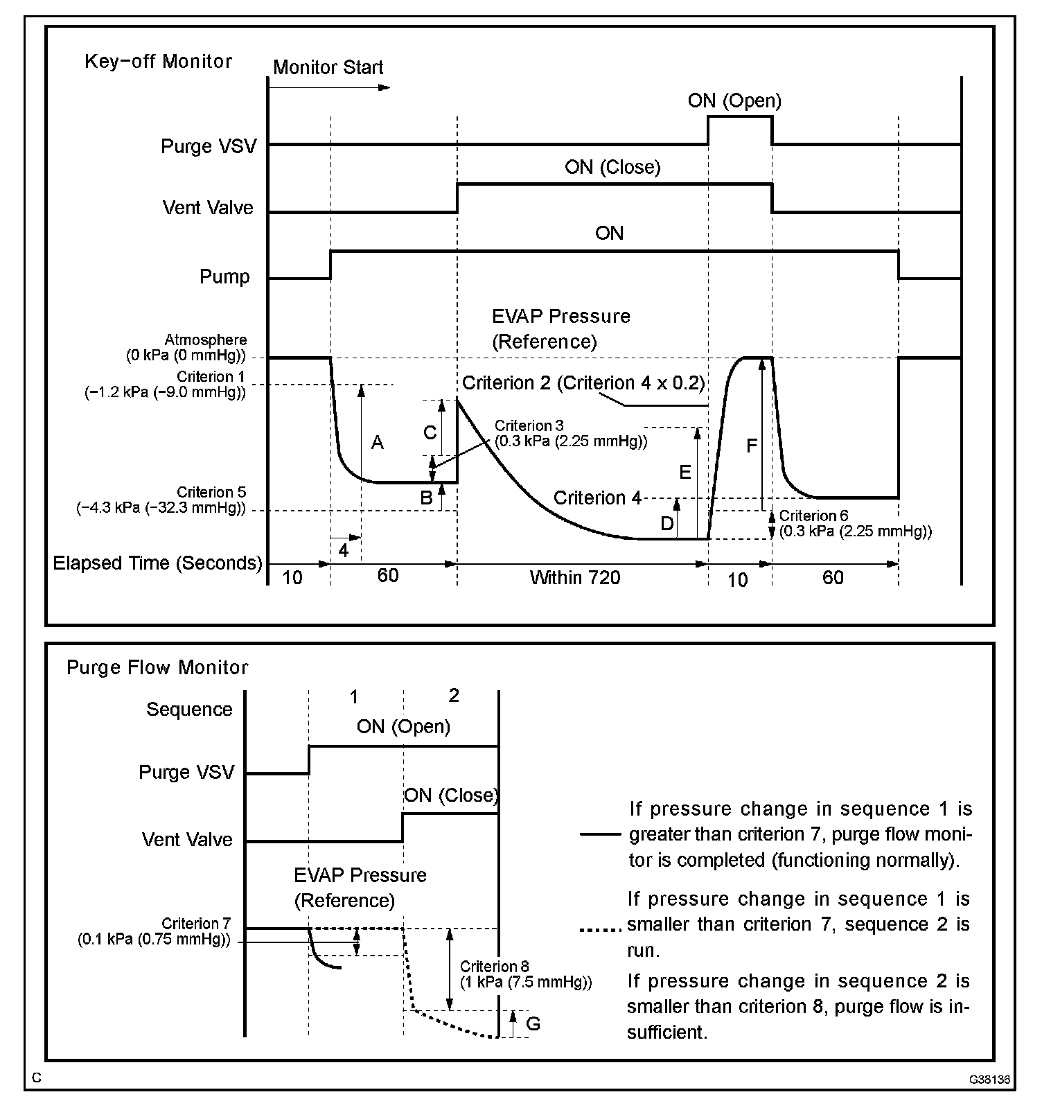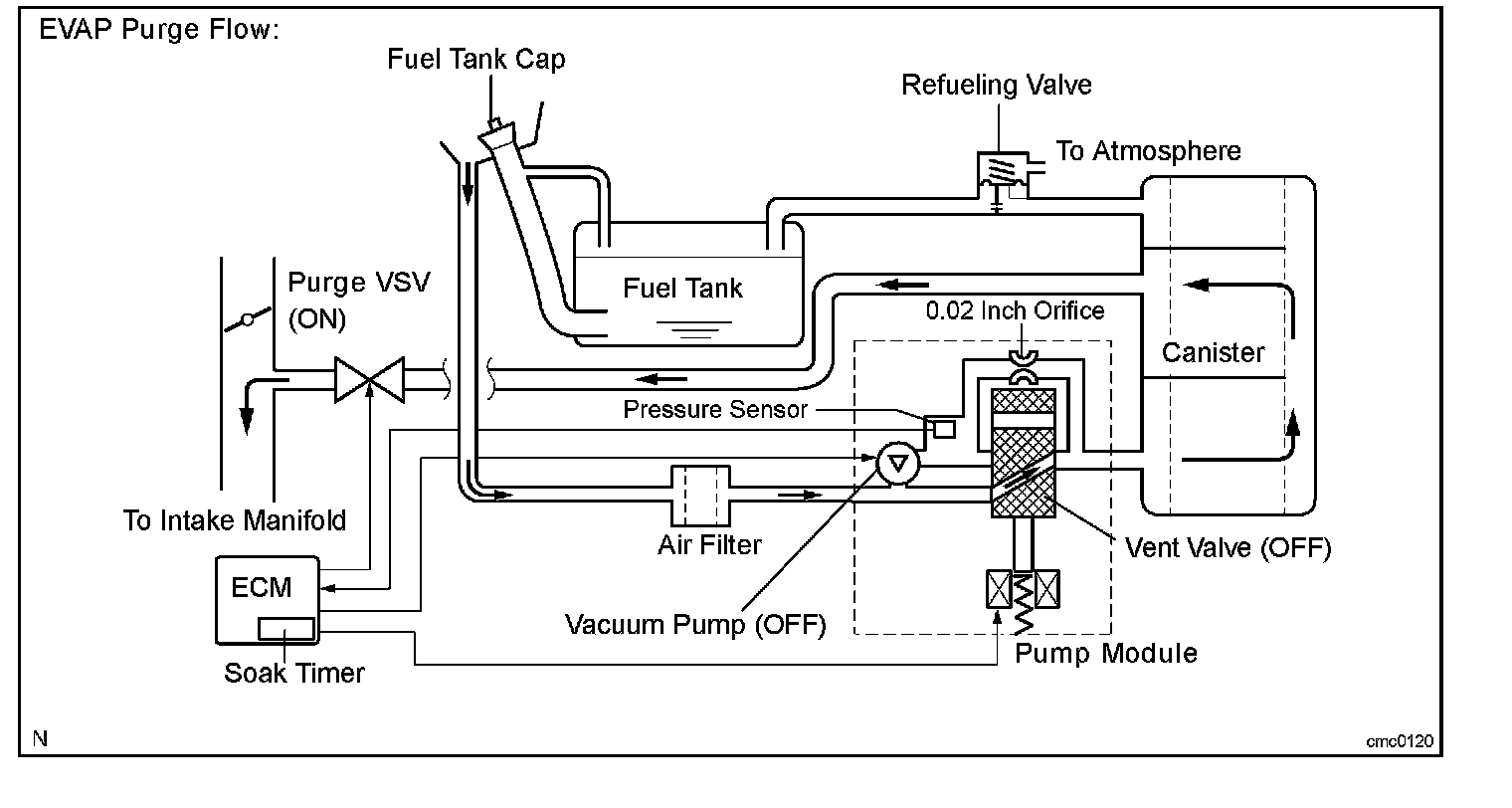 While the engine is running and the purge VSV (Vacuum Switching Valve) is ON (open), the ECM monitors the purge flow by measuring the EVAP pressure change. If negative pressure is not created, the ECM begins the 2nd monitor.