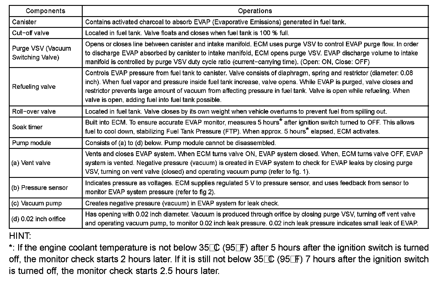 This monitor checks for EVAP (Evaporative Emission) system leaks and pump module malfunctions. The monitor starts 5 hours* after the ignition switch is turned OFF. More than 5 hours are required to allow the fuel to cool down to stabilize the Fuel Tank Pressure (FTP), thus making the EVAP system monitor more accurate.
