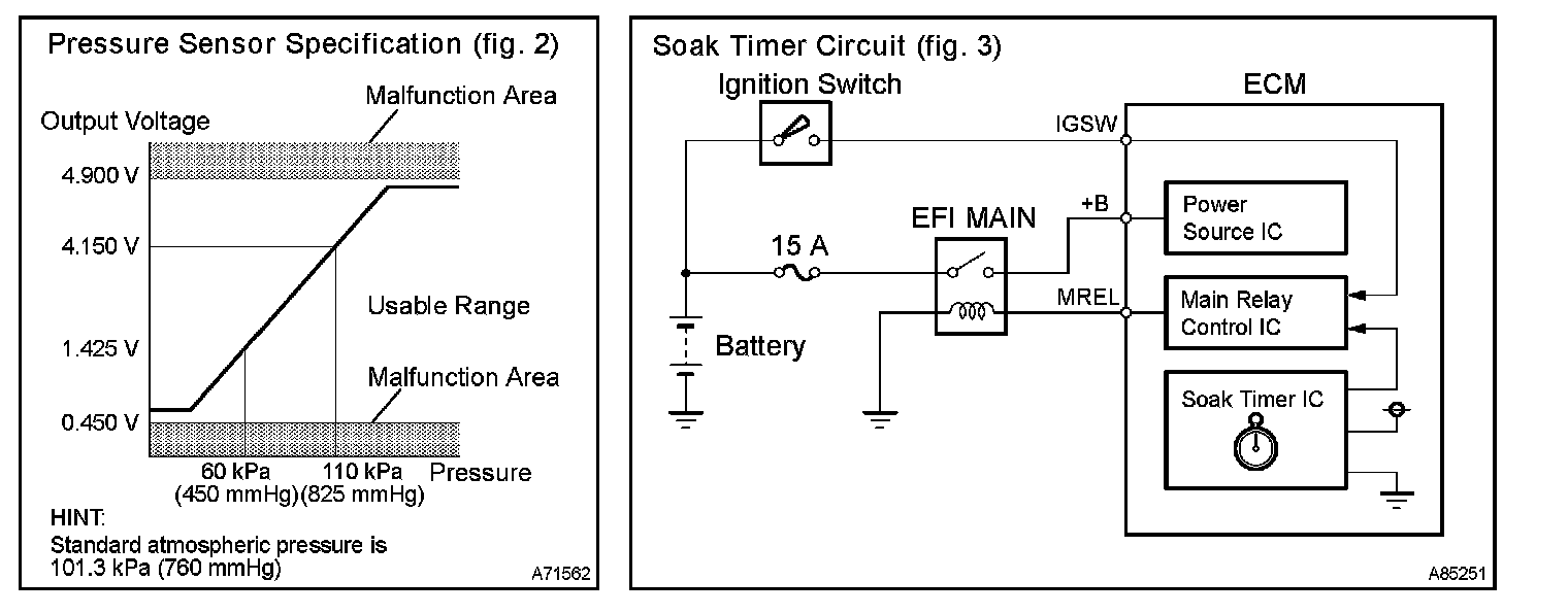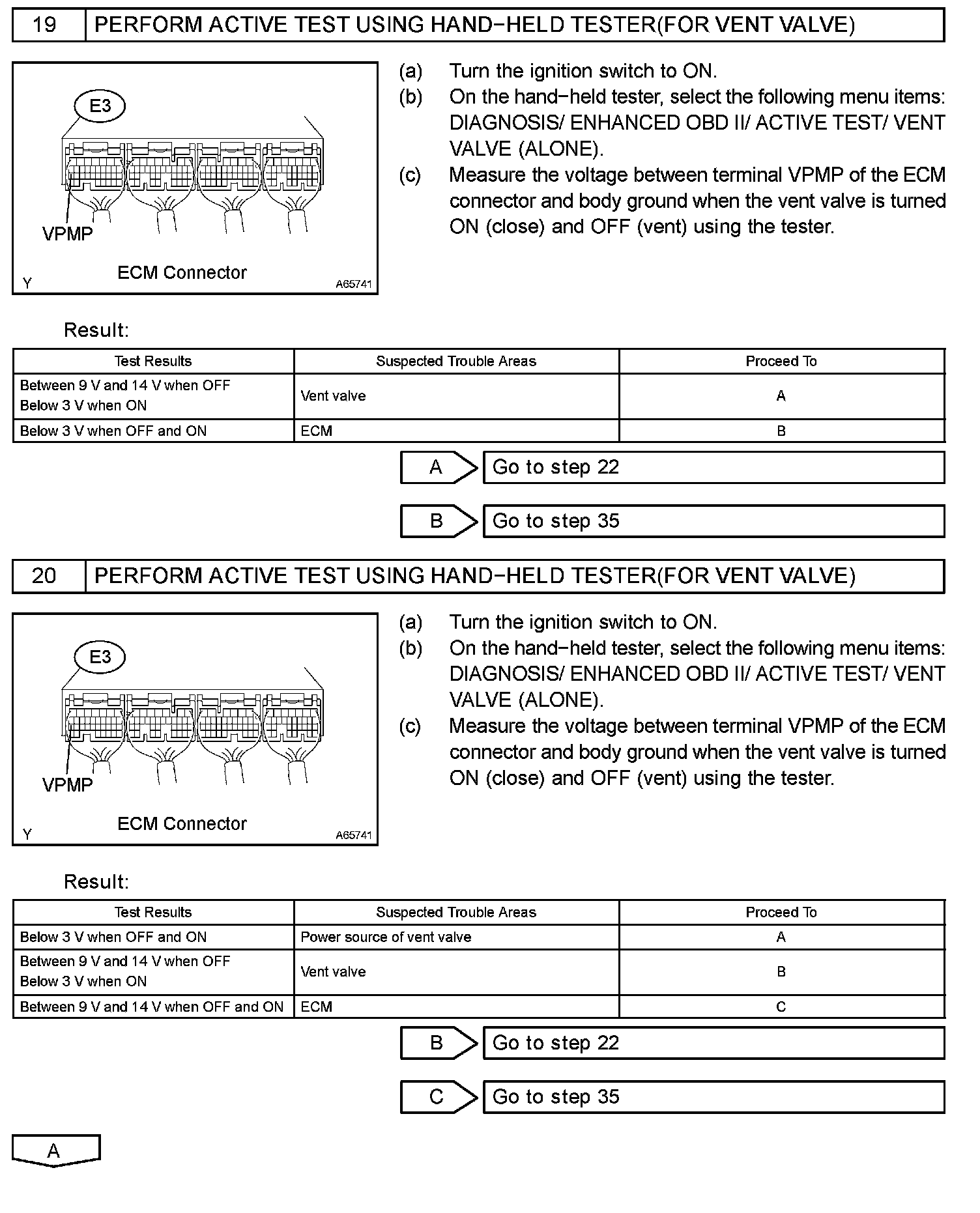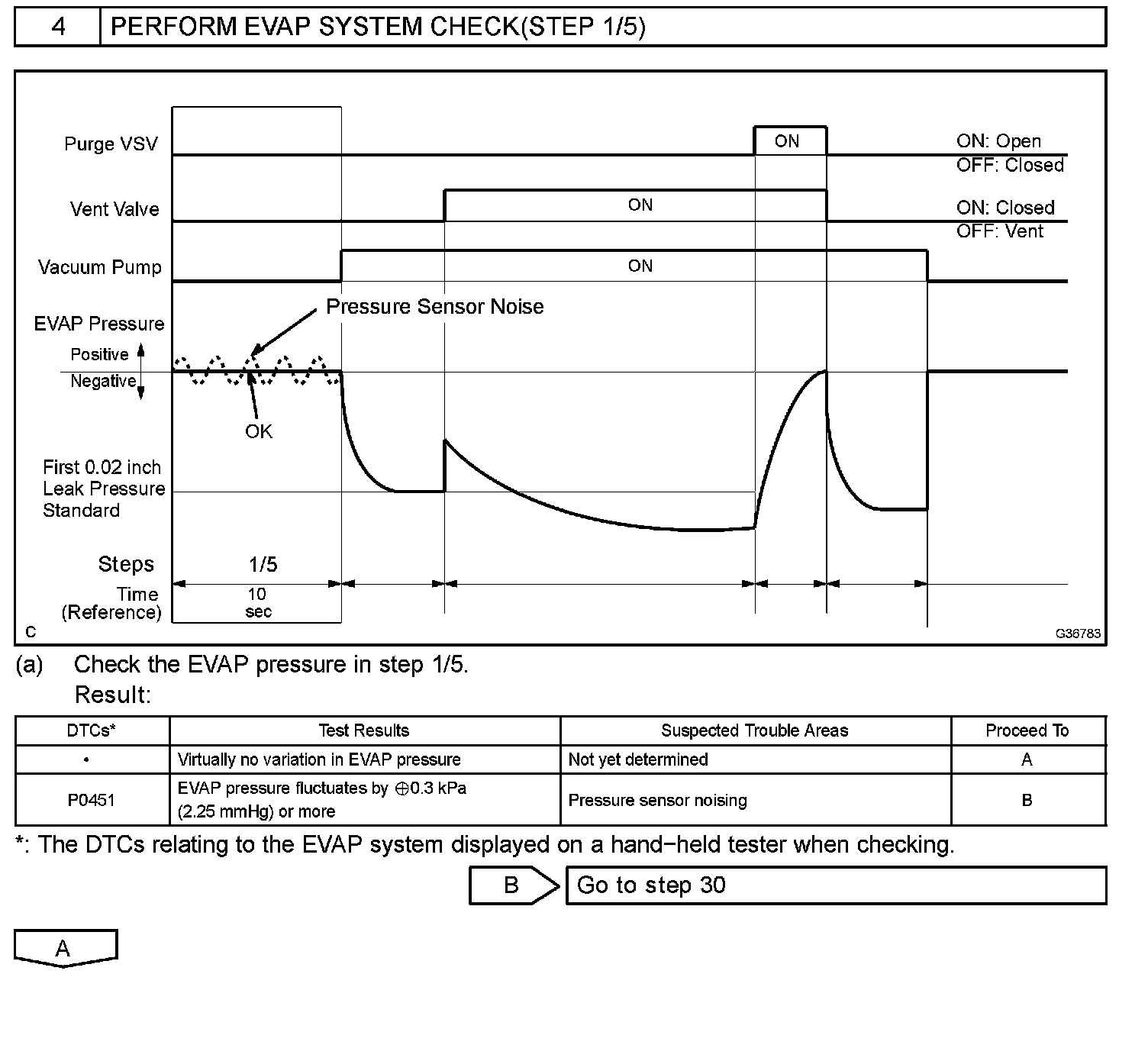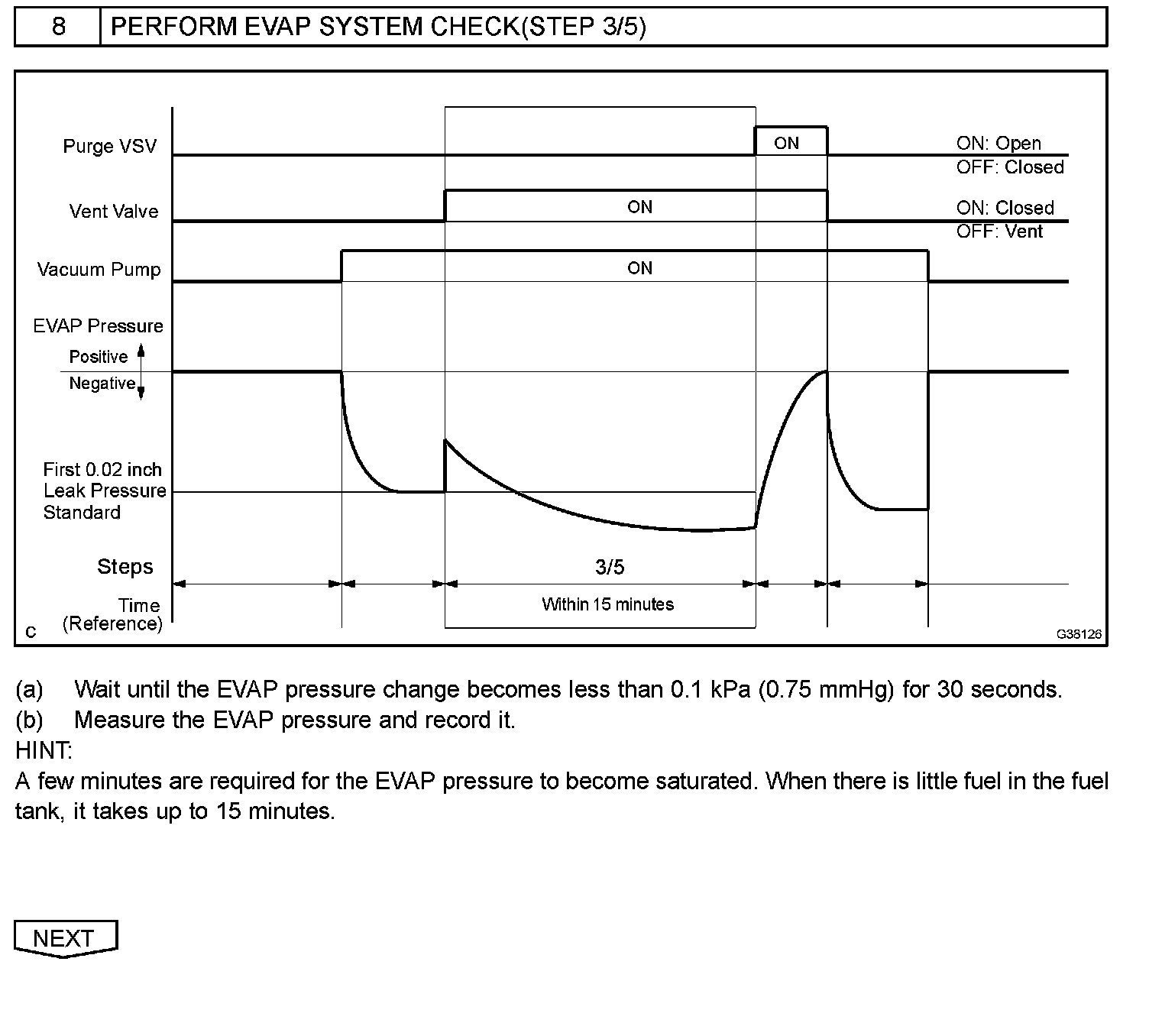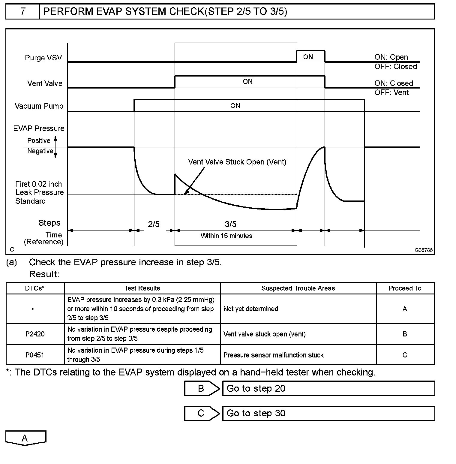 The vent valve is turned ON (closed) and the EVAP pressure is then measured. If the variation in the pressure is less than 0.5 kPa (3.75 mmHg), the ECM interprets this as the purge VSV being stuck closed, and illuminates the MIL and sets DTC P0441 (2 trip detection logic).