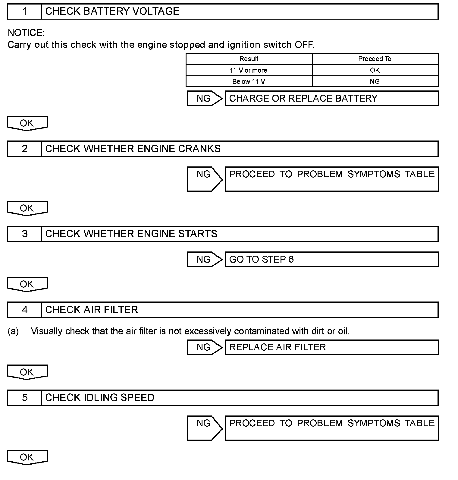 BASIC INSPECTIONWhen a malfunction is not confirmed by the DTC check, troubleshooting should be carried out in all circuits considered to be possible causes of the problem. In many cases, by carrying out the basic engine check shown in the given flowchart, the location of the problem can be found quickly and efficiently. Therefore, using this check is essential for engine troubleshooting.