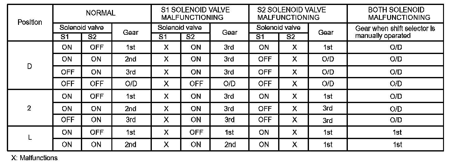 If either of the shift solenoid valve circuits develops an open or short, the ECM turns the other shift solenoid "ON" and "OFF" in order to shift into the gear positions shown in the table above.