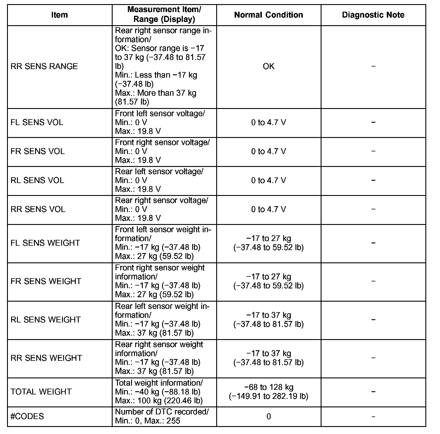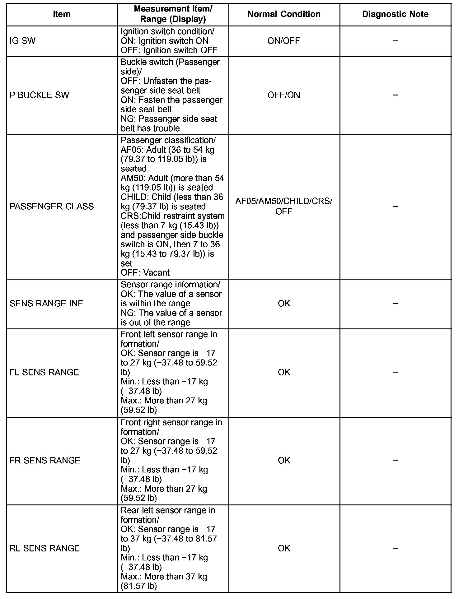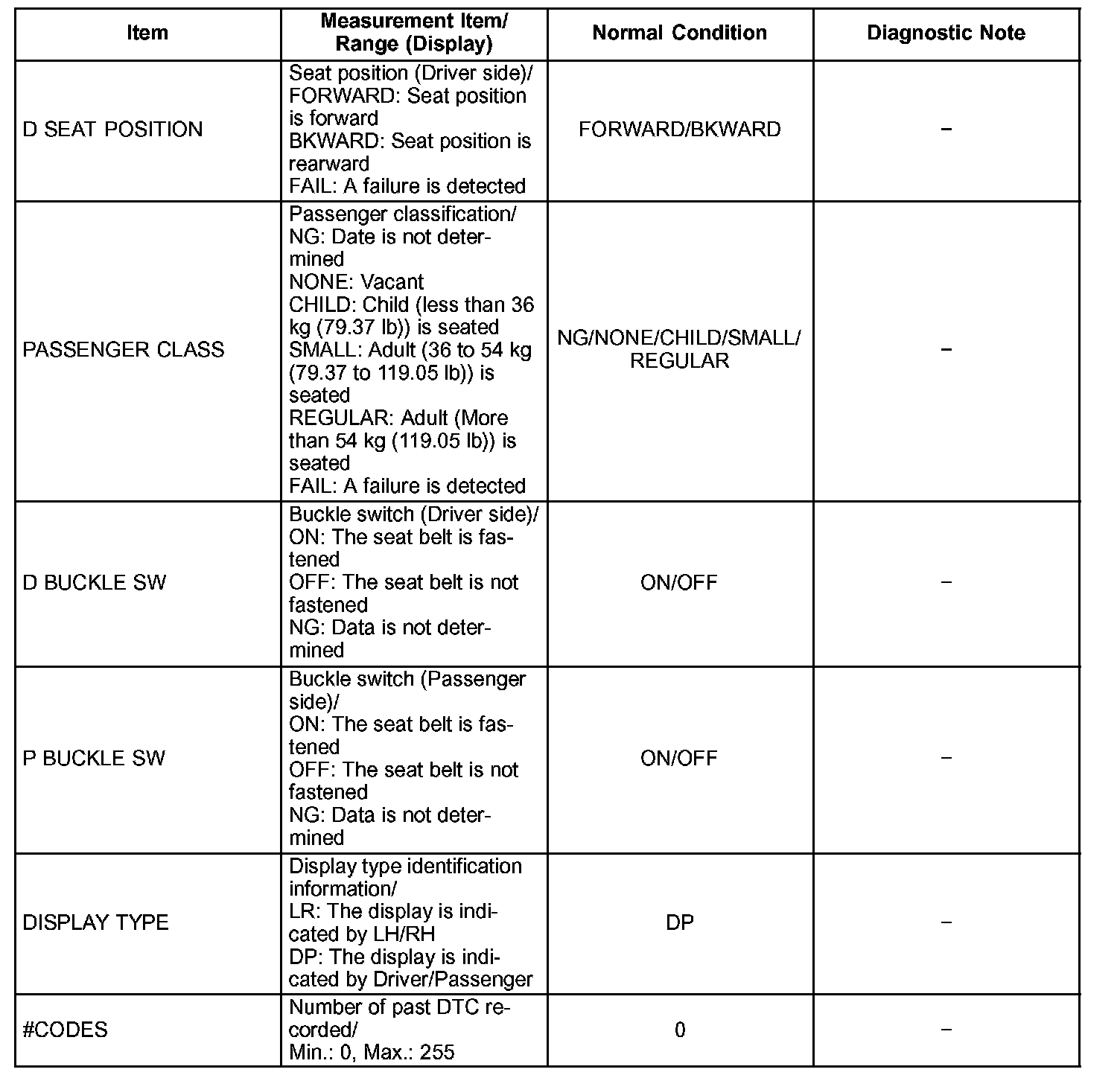 2. DATA LIST FOR OCCUPANT CLASSIFICATION ECU