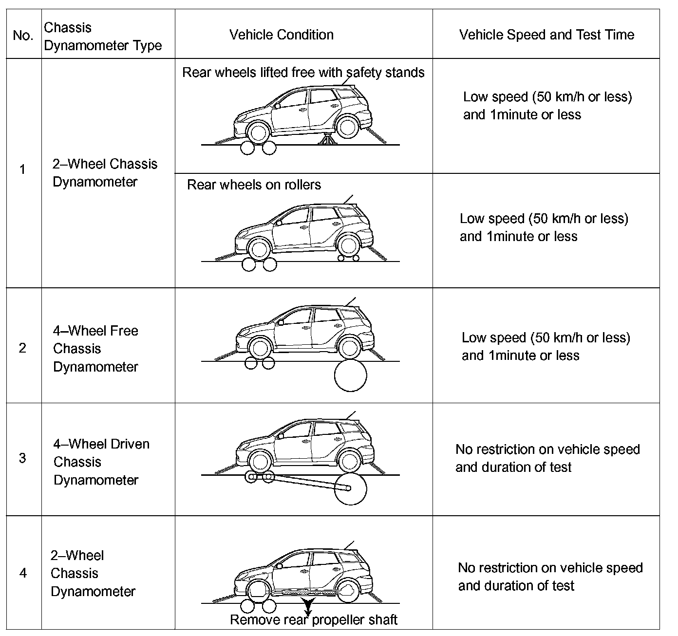 NOTE: Tester following 2 wheel load setting (2 wheel power absorption type) testers cannot be used: 1) 2 wheel chassis dynamometers, and 2) equipment that has a 2 wheel chassis dynamometer, speedometer tester and brake tester combined.