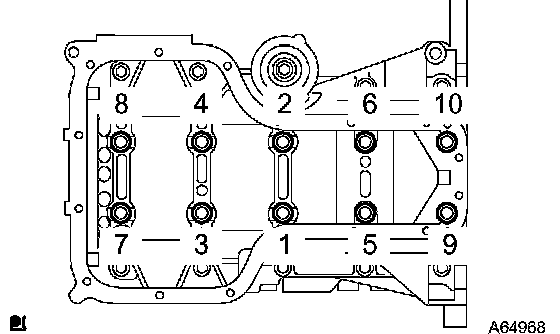 Main Bearing Cap Torque and SequenceUsing SST, tighten the bolts to the specified torque in the several passes in the sequence shown.