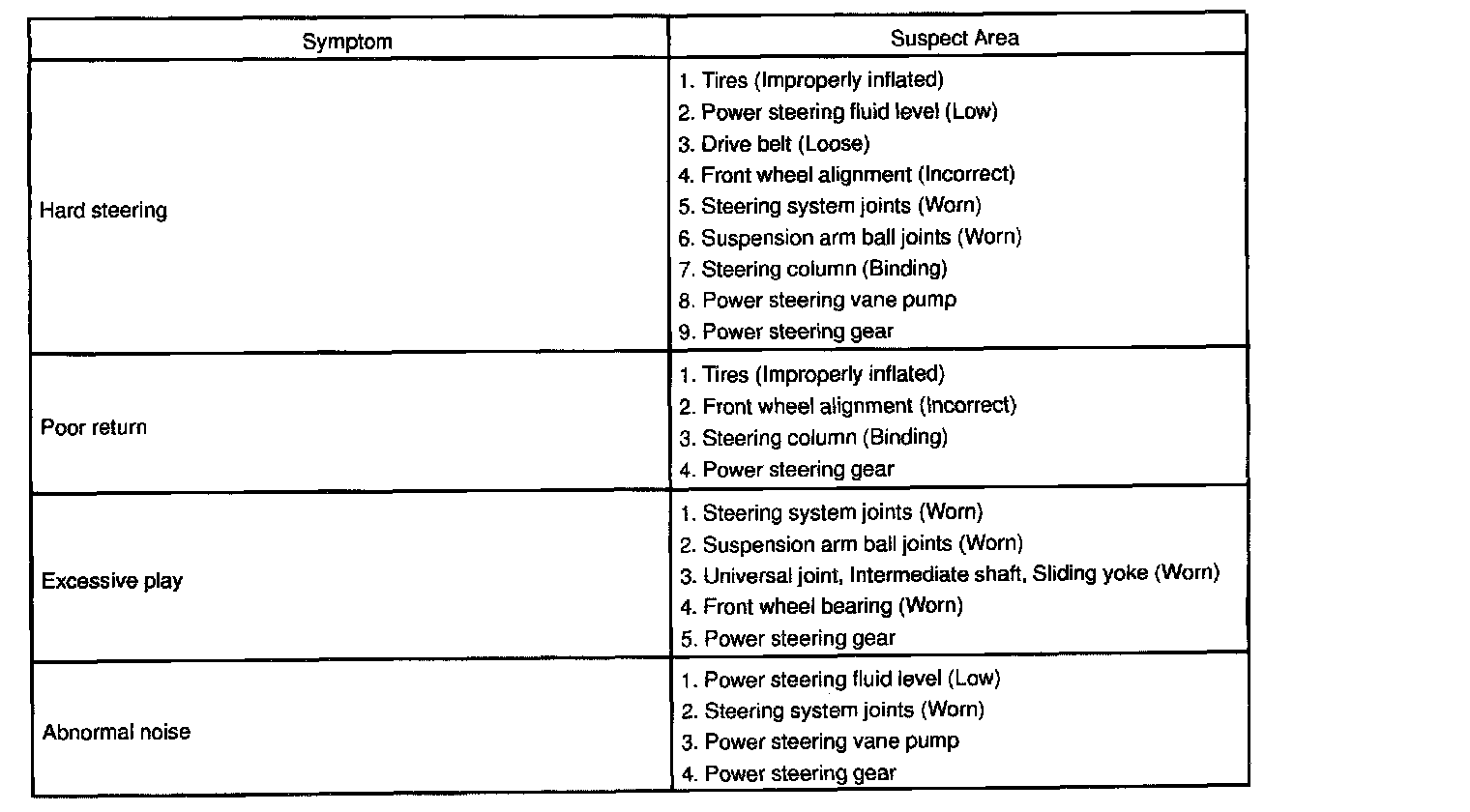 PROBLEM SYMPTOMS TABLE