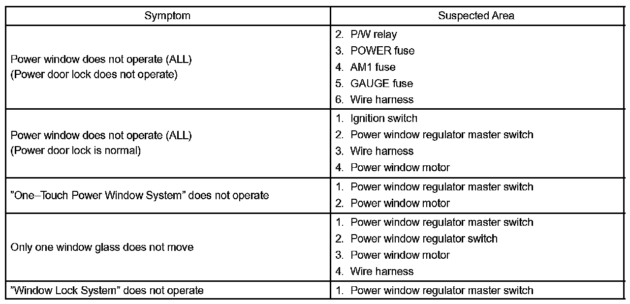 Problem Symptoms Table - Power Window Control System: