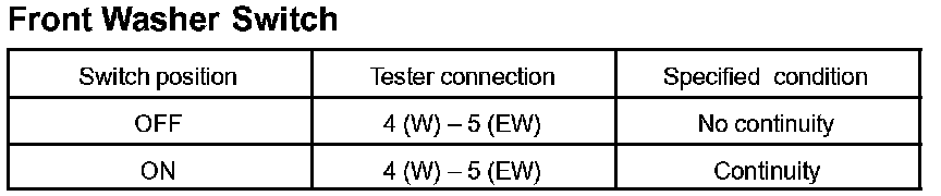 3. Connect the voltmeter (+) terminal to terminal 7 (+1) of the connector, the voltmeter (-) terminal to terminal 5 (EW) of the connector. Turn the washer switch to ON and OFF and check voltage between terminal 7 (+1) and terminal 5 (EW).