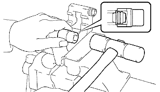 c) Using a socket wrench (19 mm) and hammer, drive the 2 bush dust boots to the disc brake cylinder mounting.