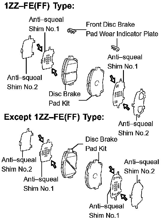 c) 1ZZ-FE(FF) type: Install the pad wear indicator plate facing upward, and install each pad.