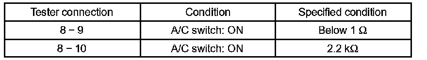 (1) Connect the positive (+) lead from the battery to terminal 8 and the negative (-) lead to terminal 10 while the A/C switch is pressed, then check that the illuminations light up. If operation is not as specified, replace the combination switch assembly.