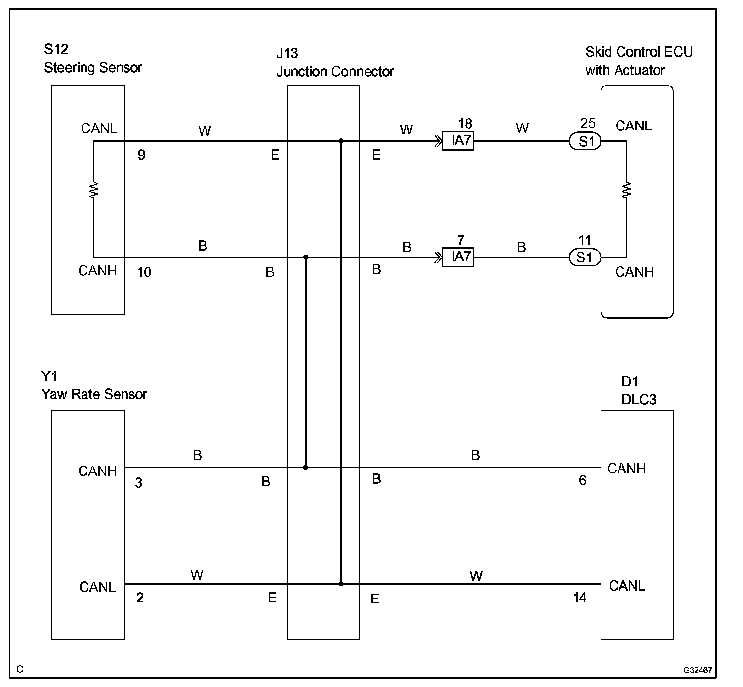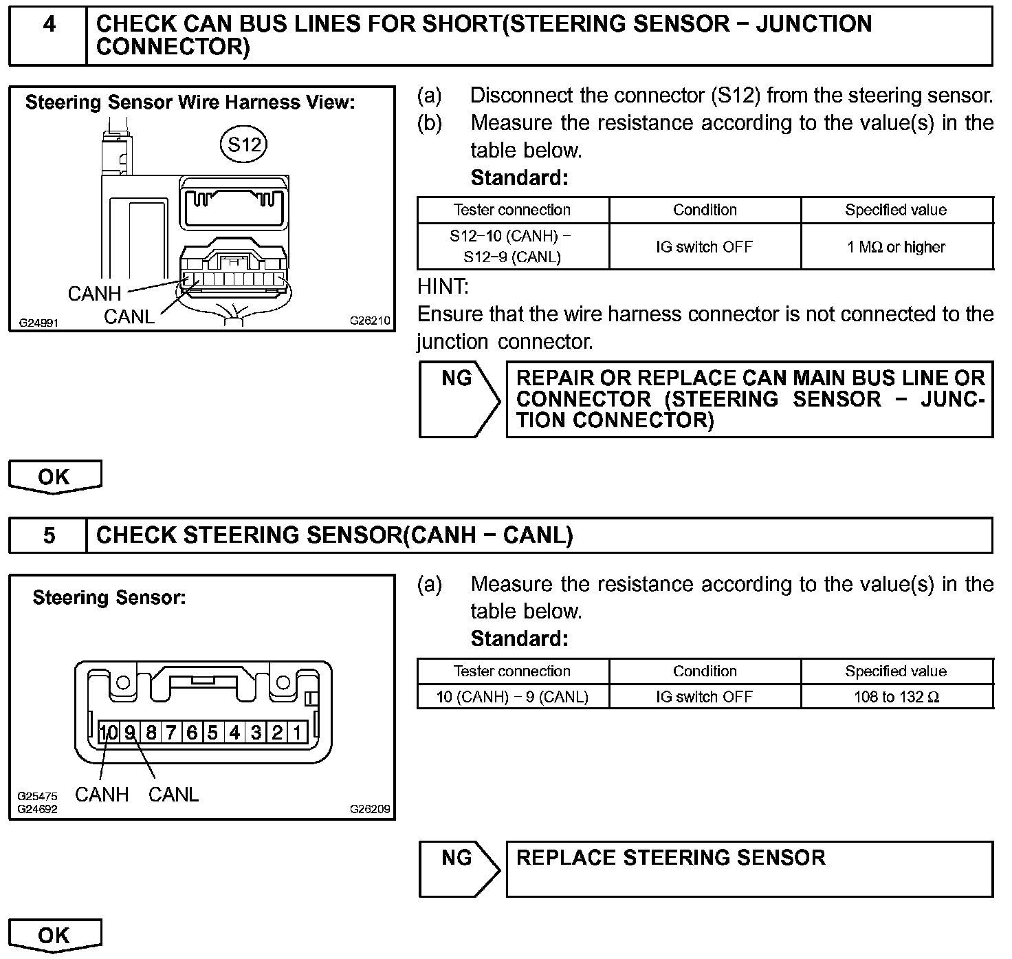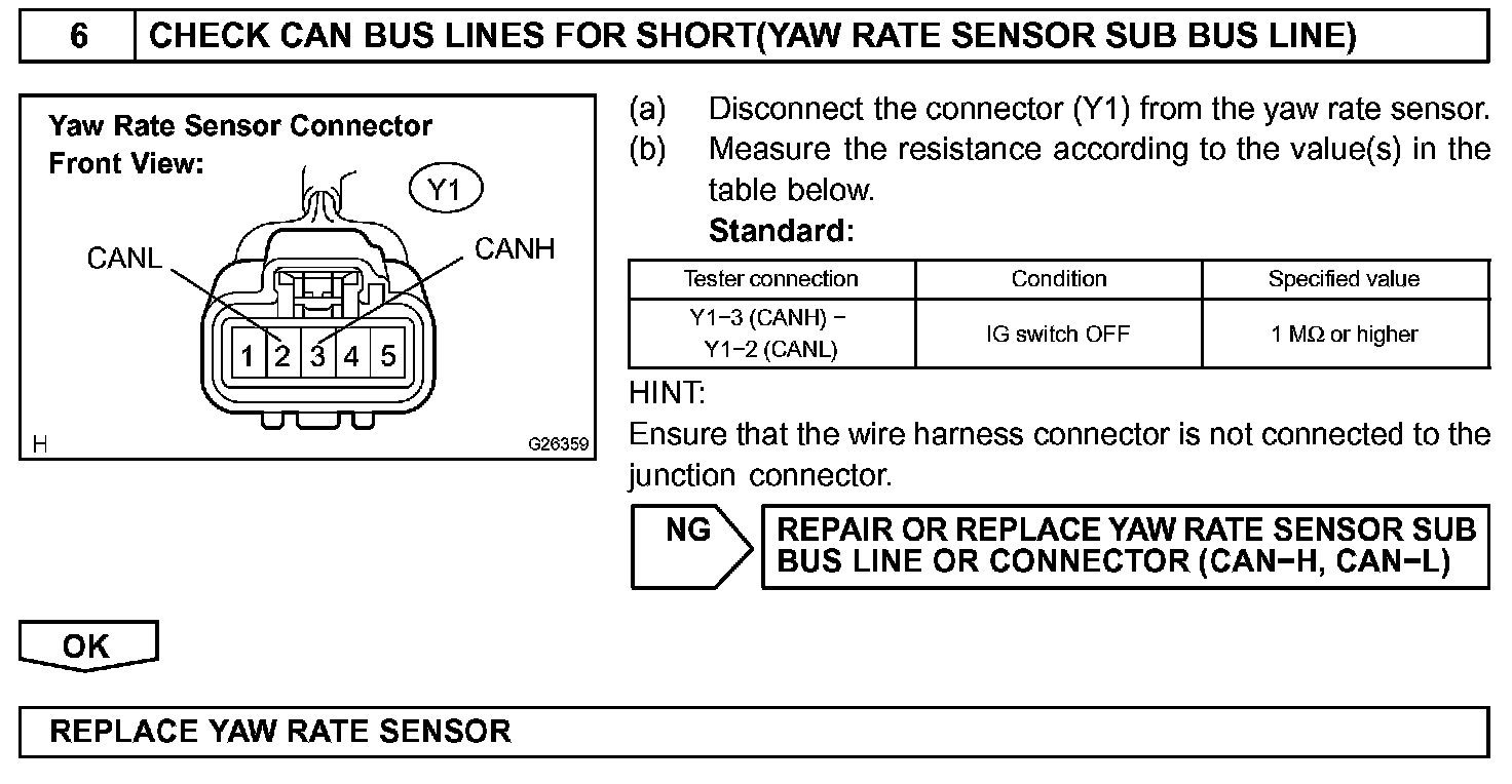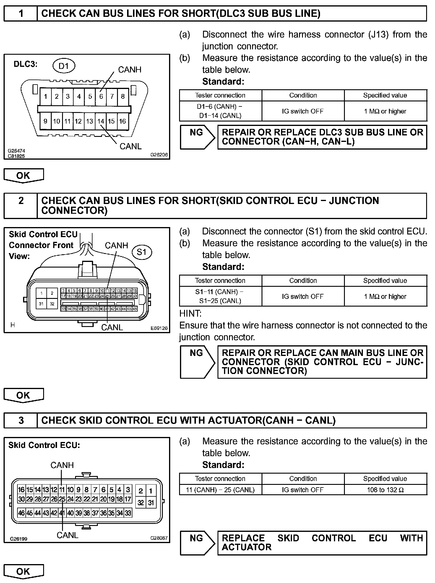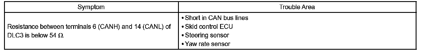 The CAN bus lines are considered to be shorted when the resistance between terminals 6 (CANH) and 14 (CANL) of the DLC3 is below 54 Ohms.