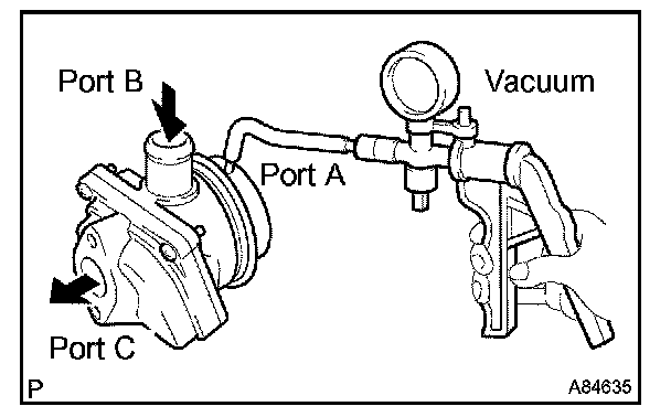 1. Apply a vacuum of 28 kPa (210 mmHg, 8.27 in.Hg) to port A, then blow air into port B. Check that the air is discharged from port C.