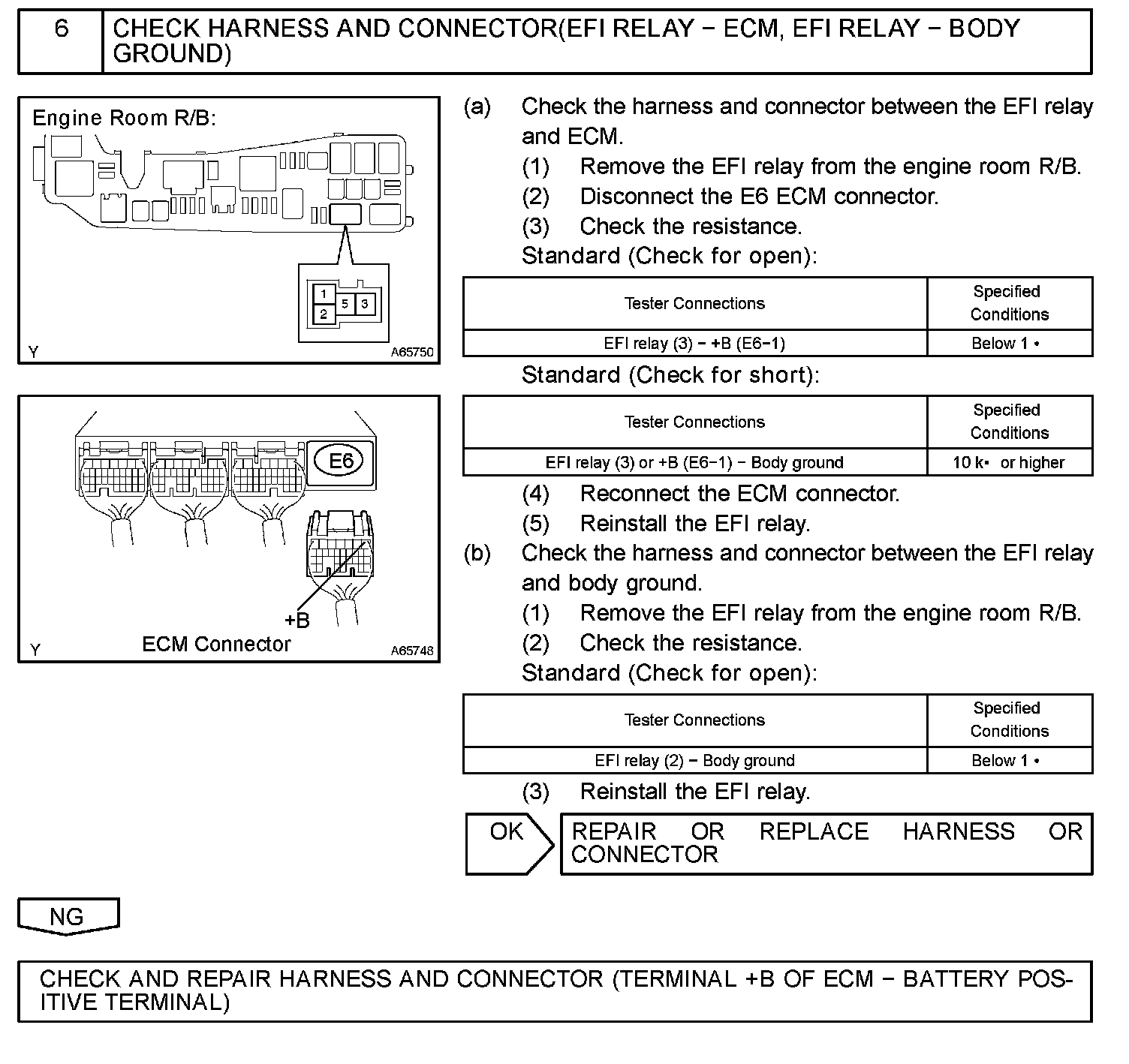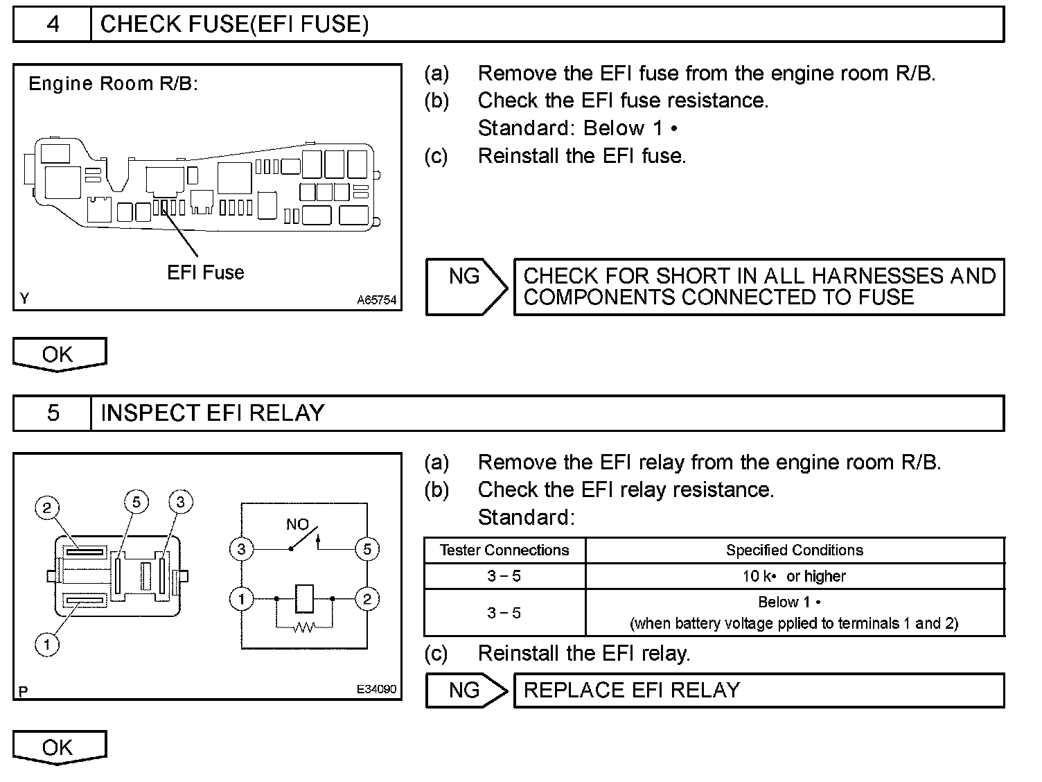 When the ignition switch is turned to ON, the battery voltage is applied to terminal IGSW of the ECM. The ECM MREL output signal causes a current to flow to the coil, closing the contacts of the EFI relay and supplying power to terminal +B of the ECM.