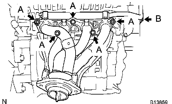 Install a new gasket and the exhaust manifold with the 4 bolts and 2 nuts.