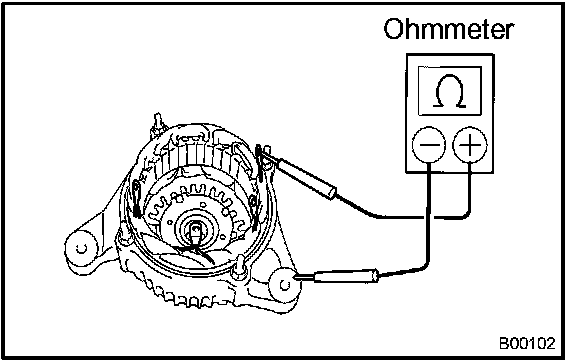 When the positive and negative poles of the positive (+) terminal and each rectifier terminal are switched over, there is a resistance of below 1 Ohm in one direction but 10 kOhms or higher in the other direction.