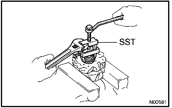 d. To loosen the pulley nut, turn SST 1-A in the direction shown in the illustration.