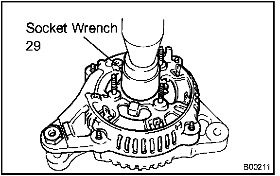 a. Using a socket wrench 29 and a press, slowly push the generator rectifier end frame in.