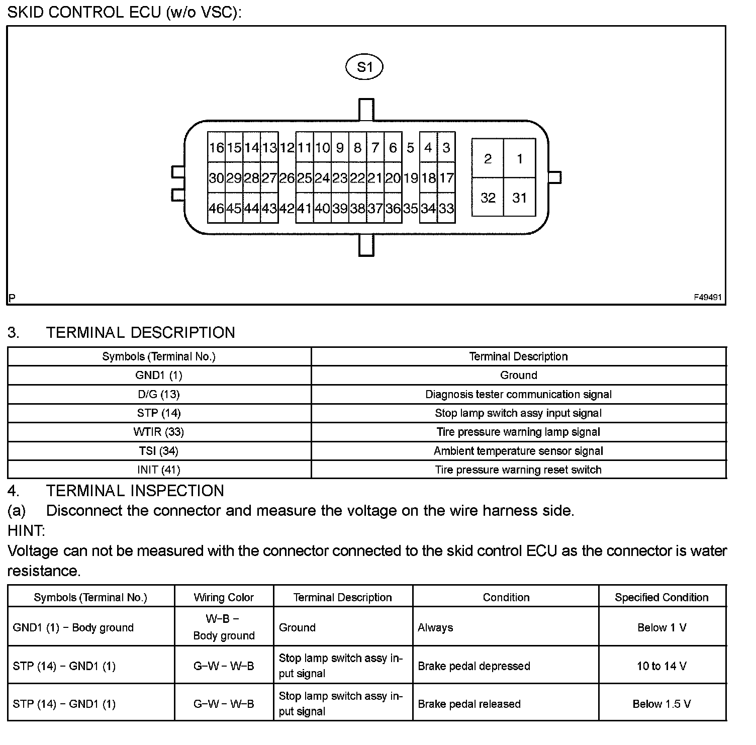Terminals Of Control Module/Pinouts - Skid Control ECU (w/o VSC):