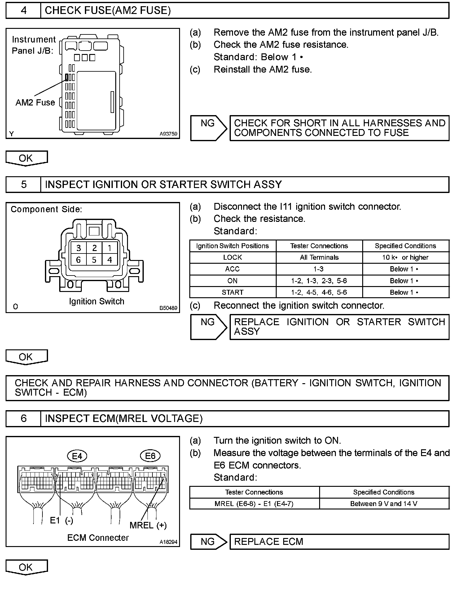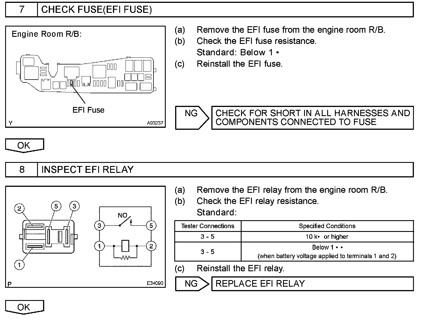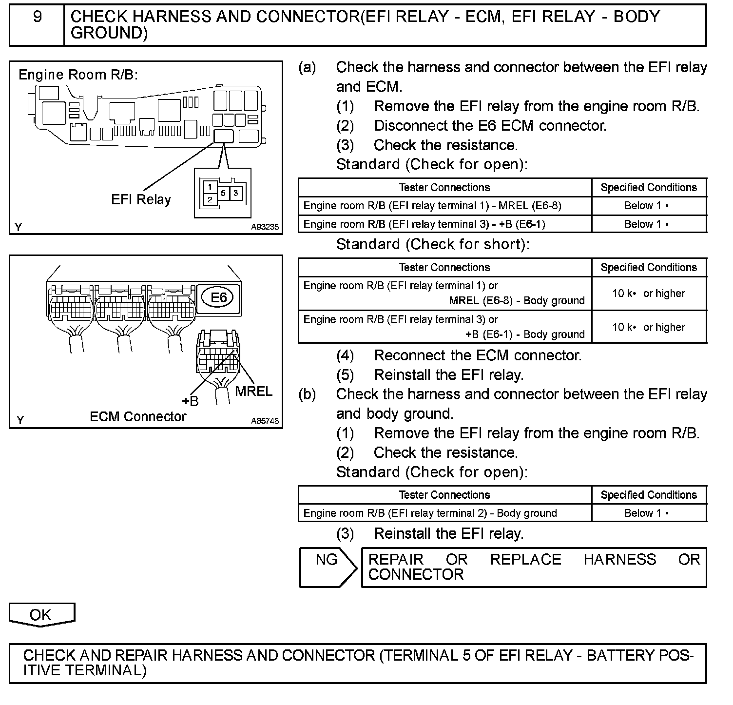 When the ignition switch is turned to ON, the battery voltage is applied to terminal IGSW of the ECM. The ECM MREL output signal causes a current to flow to the coil, closing the contacts of the EFI relay and supplying power to terminal +B of the ECM.