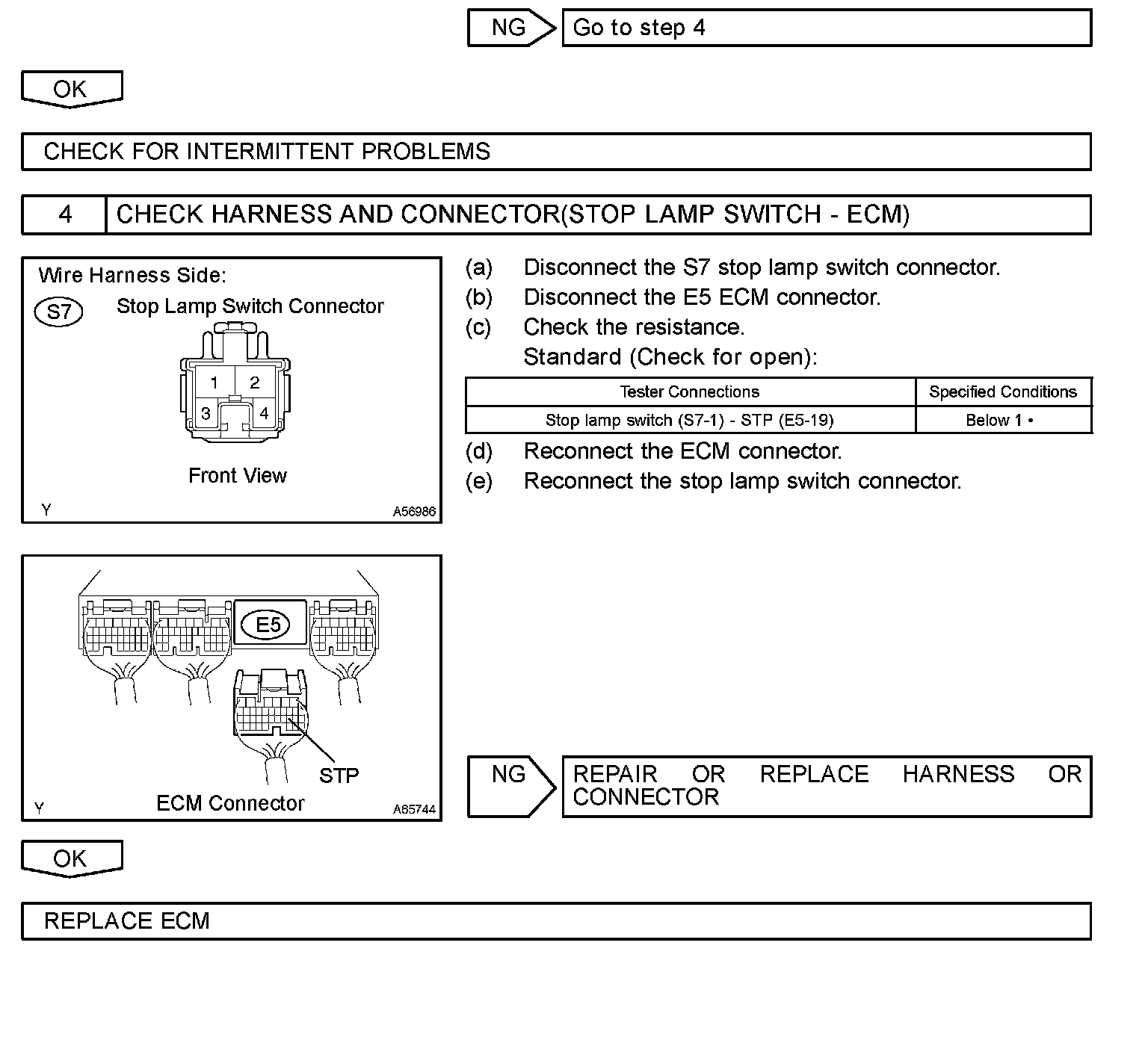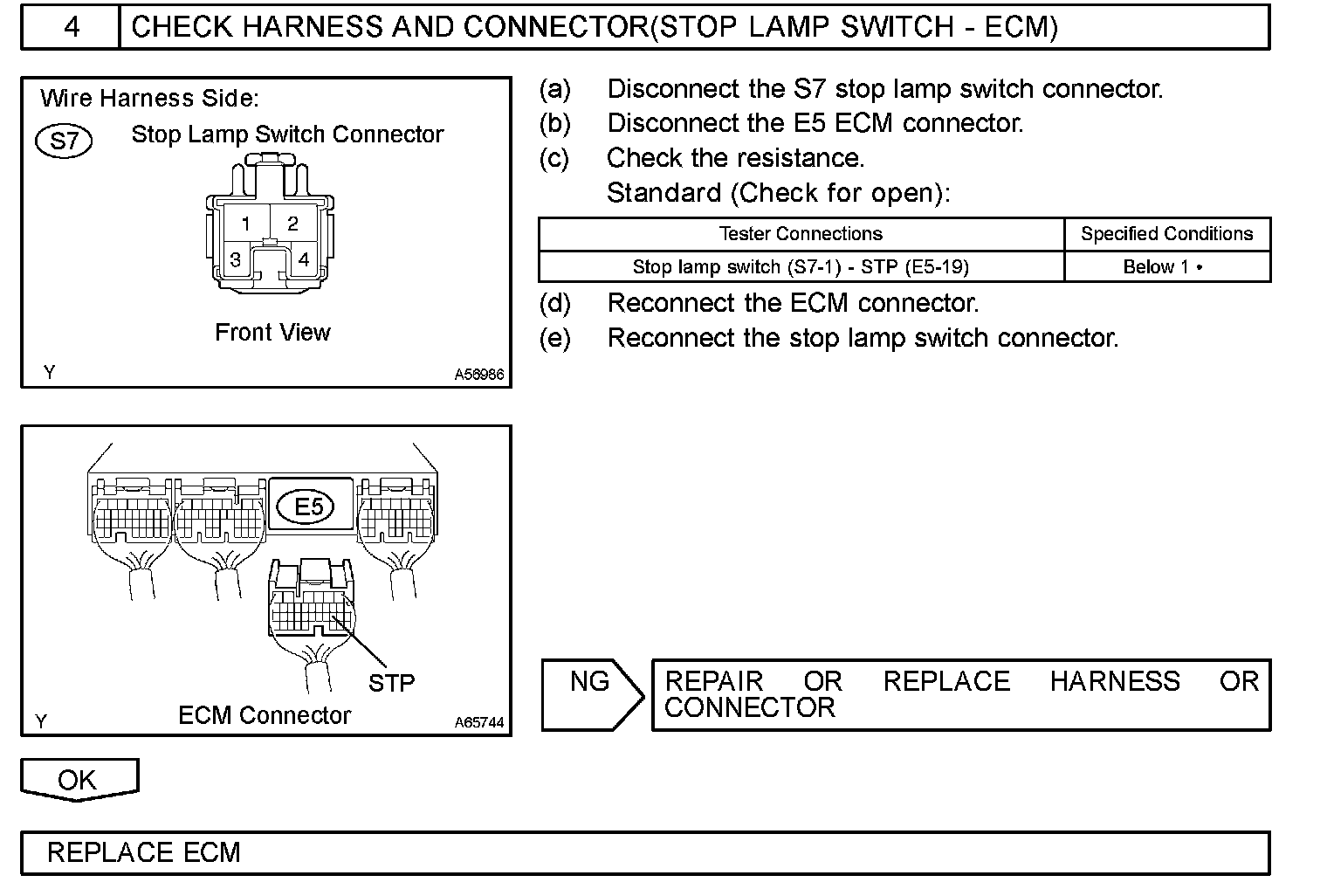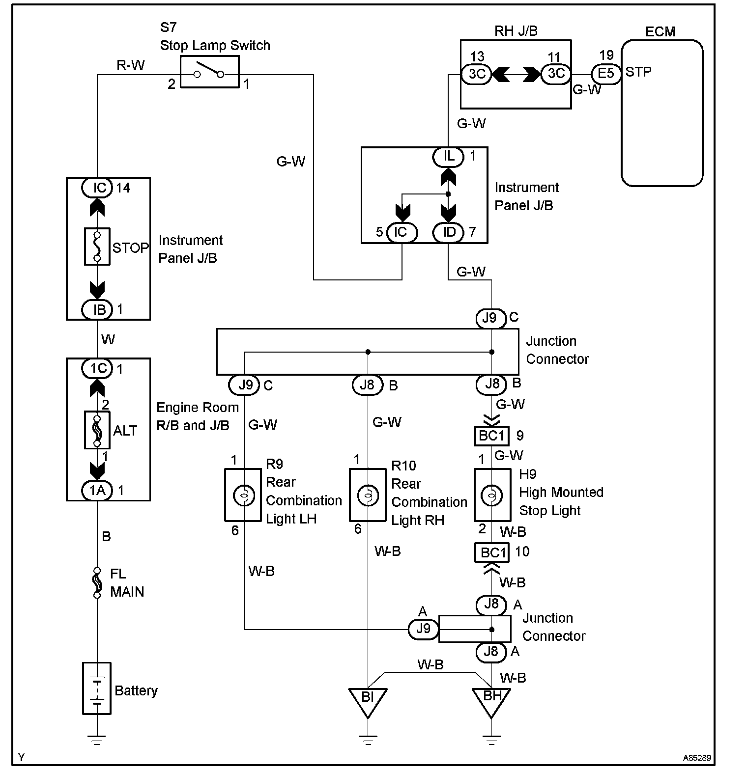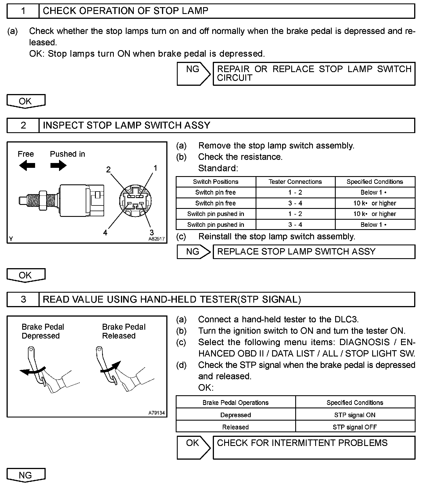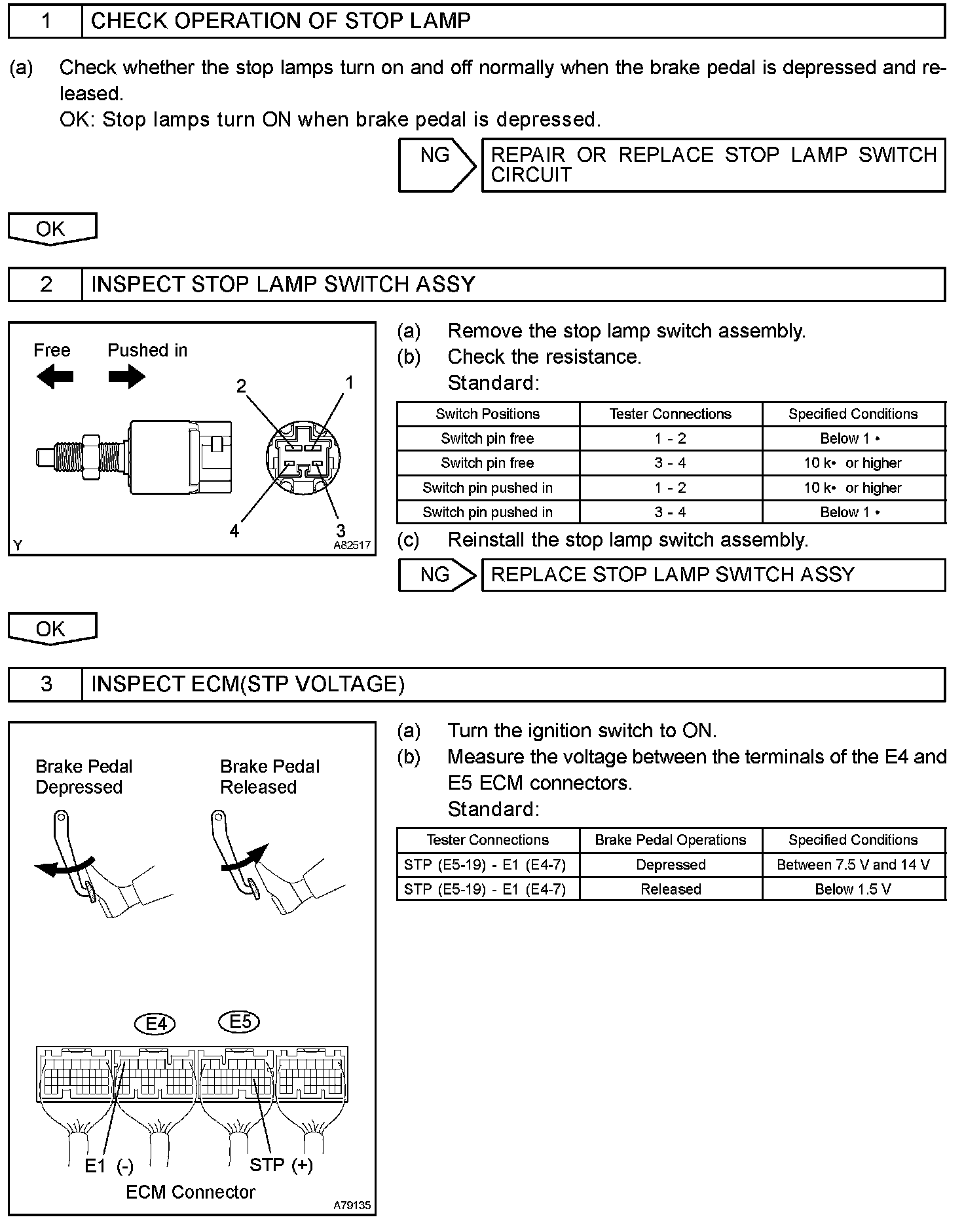 When the brake pedal is depressed, the stop lamp switch turns on and transmits an STP signal to the ECM. Upon receipt of the STP signal, the ECM determines that the brakes have been applied. The signal voltage level is the same as that of the voltage which is applied to the stop lamps.