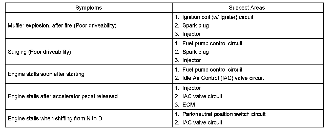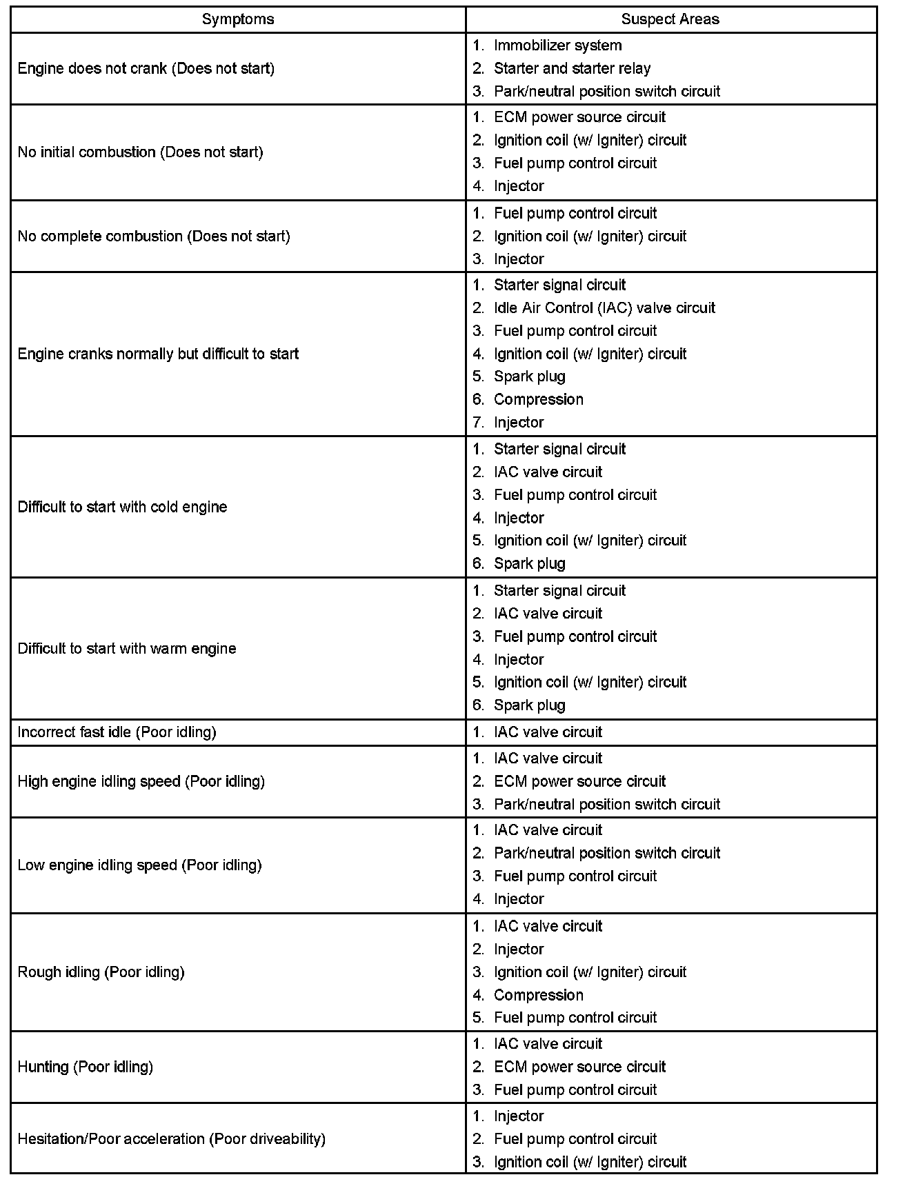 HINT: When a malfunction is not confirmed by a DTC (Diagnostic Trouble Code) check and the cause of problem cannot be identified through a basic inspection, troubleshoot according to the priority order indicated in the table given.