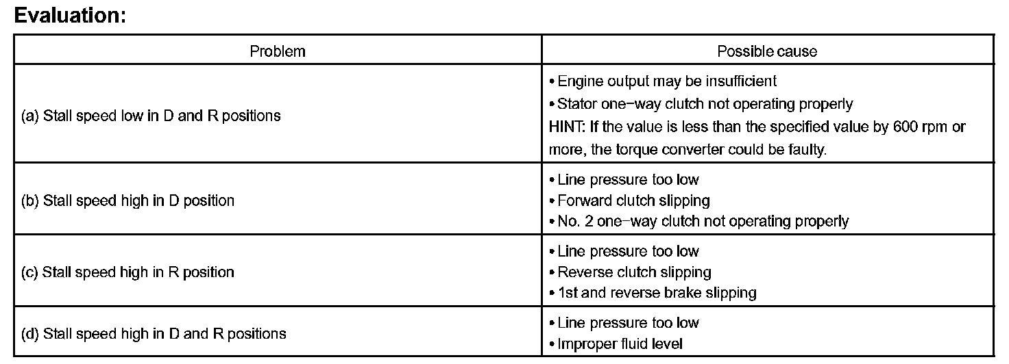 The object of this test is to check the overall performance of the transaxle and engine by measuring the stall speeds in the D and R positions.