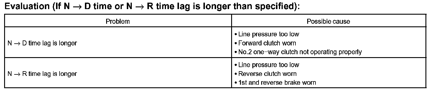 When the shift lever is shifted while the engine is idling, there will be a certain time lapse or lag before the shock can be felt. This is used for checking the conditions of the No.2 one-way clutch, reverse clutch, forward clutch, and 1st and reverse brake.