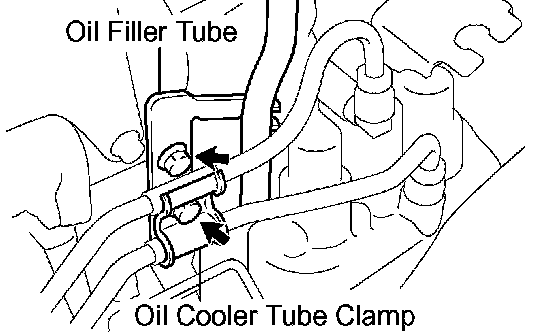 b. Remove the 2 bolts, oil cooler tube clamp and oil filler tube.