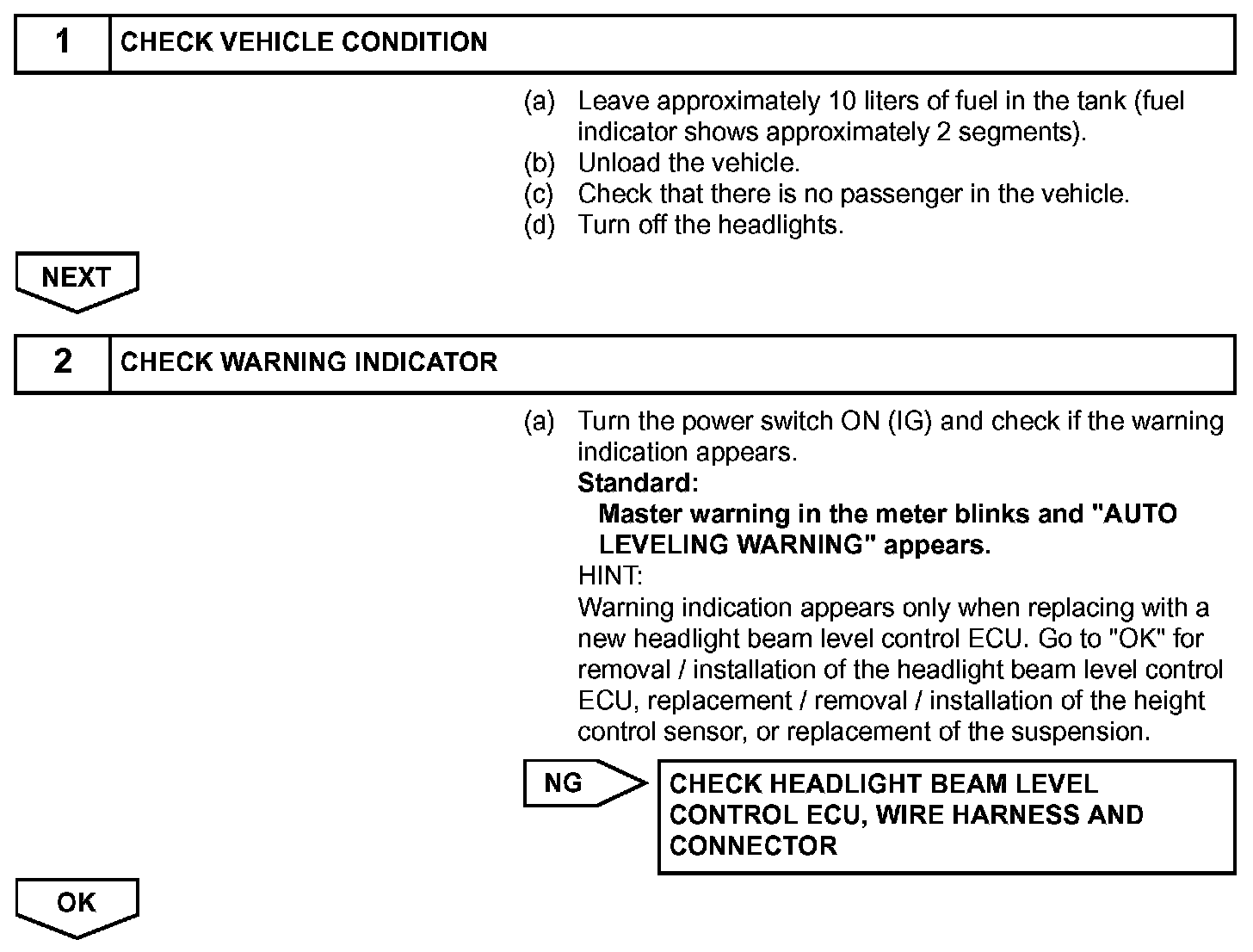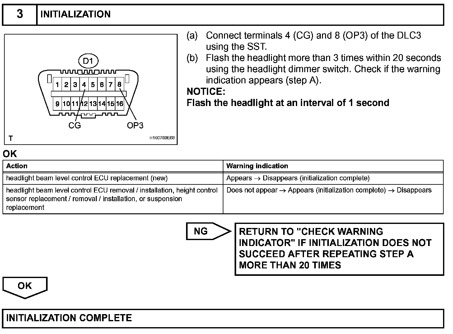 - Initialize the headlight beam level control ECU when: vehicle height changes by such means as removal, installation, and replacement of the height control sensor, replacement of the suspension, or replacement of the headlight beam level control ECU assembly.