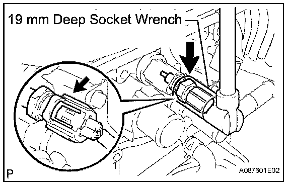 a. Using a 19 mm deep socket wrench, install a new gasket and the sensor.