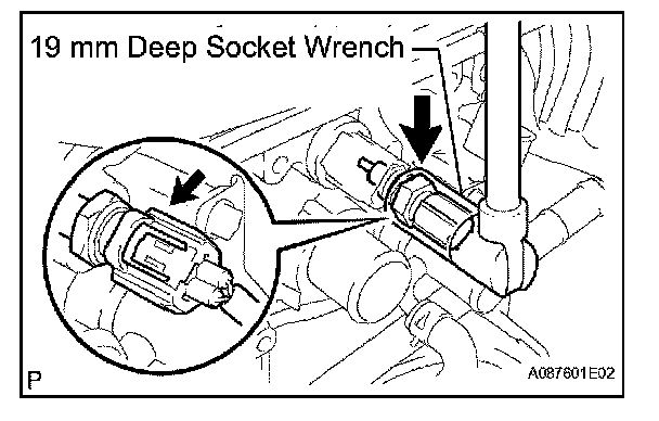 b. Using a 19 mm deep socket wrench, remove the sensor and gasket.