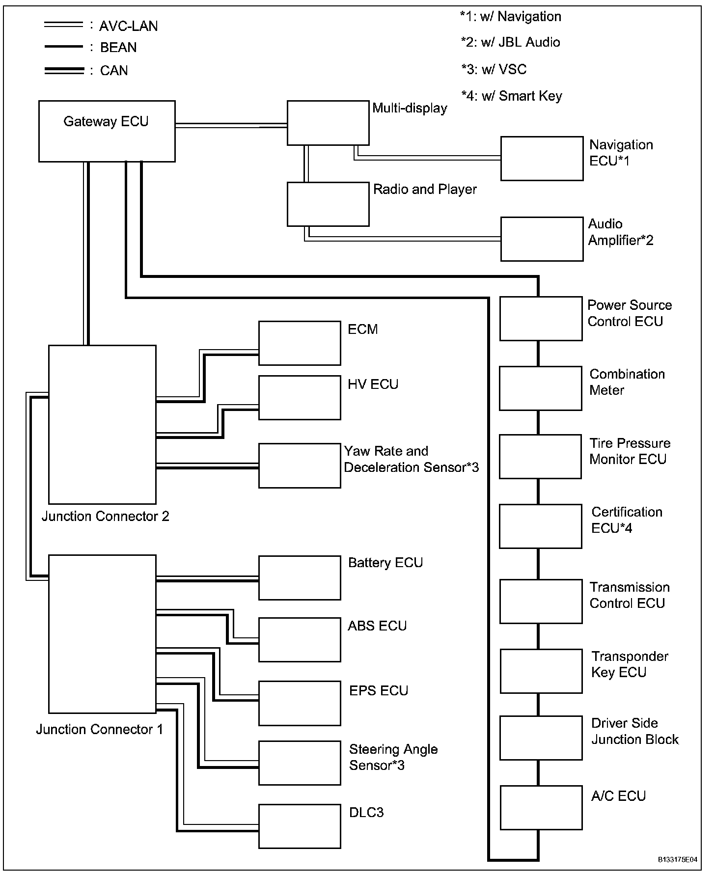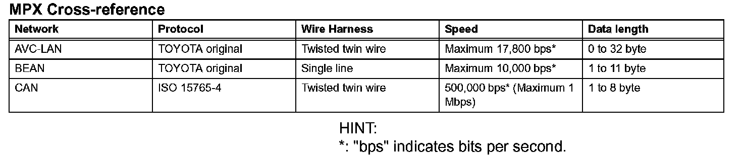 The MPX connects the ECUs of this vehicle and uses an ON-OFF signal (binary 0 and 1) to communicate with each ECU. The ECU operates the actuator based on the other ECU information. For example, the ECM (PCM) allows the engine to start based on the transponder key ECU information. The MPX consists of 3 networks: AVC-LAN (Audio Visual Communication Local Area Network), BEAN (Body Electronics Area Network) and CAN (Controller Area Network). The gateway ECU is connected to and coordinates communication between the 3 networks.