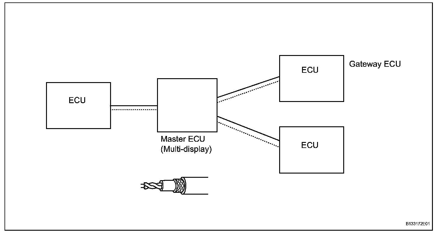The audio/visual system uses the AVC-LAN. The master ECU is connected to gateway ECU and sends the signal to the other ECUs. The wire harness is a twisted twin wire covered with the insulation. One wire is used for the positive voltage and the other wire is used for the negative voltage.
