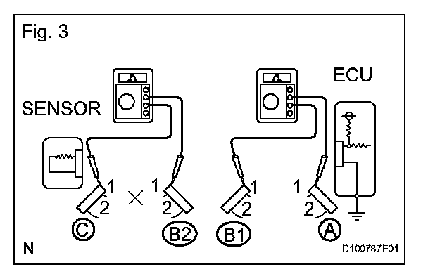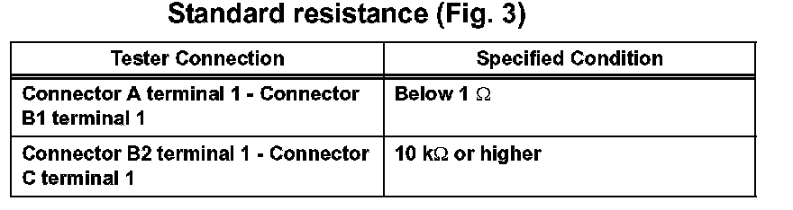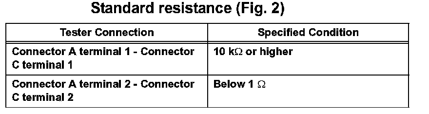 HINT: Measure the resistance while lightly shaking the wire harness vertically and horizontally. If the results match the examples above, an open circuit exists between terminal 1 of connector A and terminal 1 of connector C.
