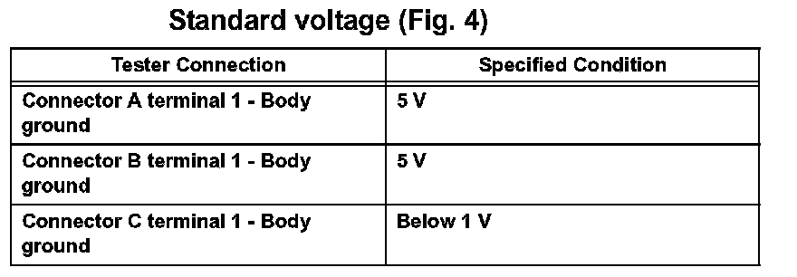 1. In a circuit in which voltage is applied to the ECU connector terminal, an open circuit can be checked by conducting a voltage check. With each connector still connected, measure the voltage between the body ground and these terminals (in this order): 1) terminal 1 of connector A, 2) terminal 1 of connector B, and 3) terminal 1 of connector C.