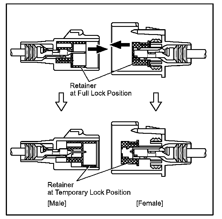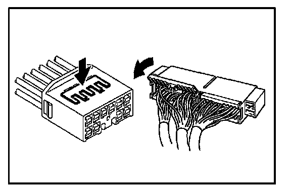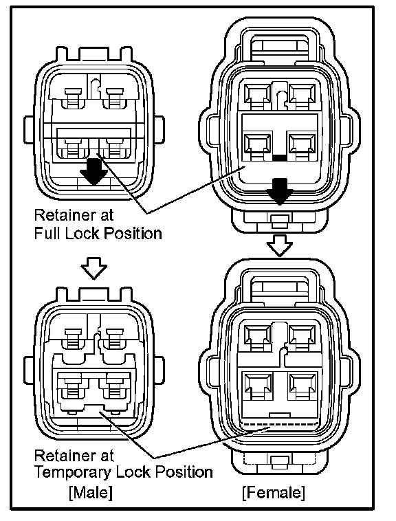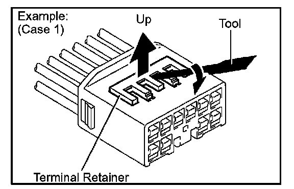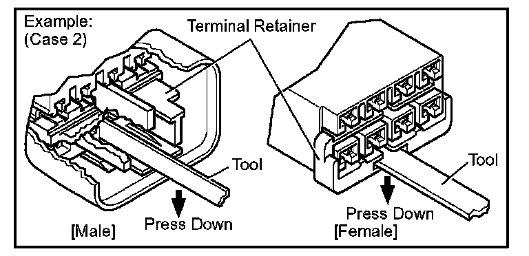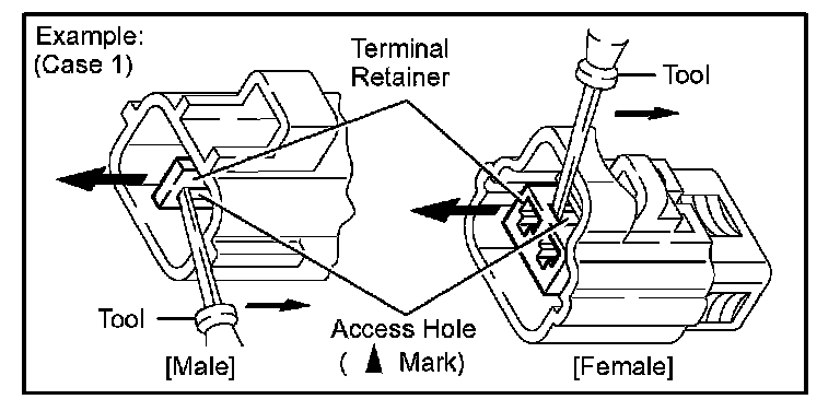 Insert the special tool into the terminal retainer access hole (/\ Mark) and pull the terminal retainer up to the temporary lock position.