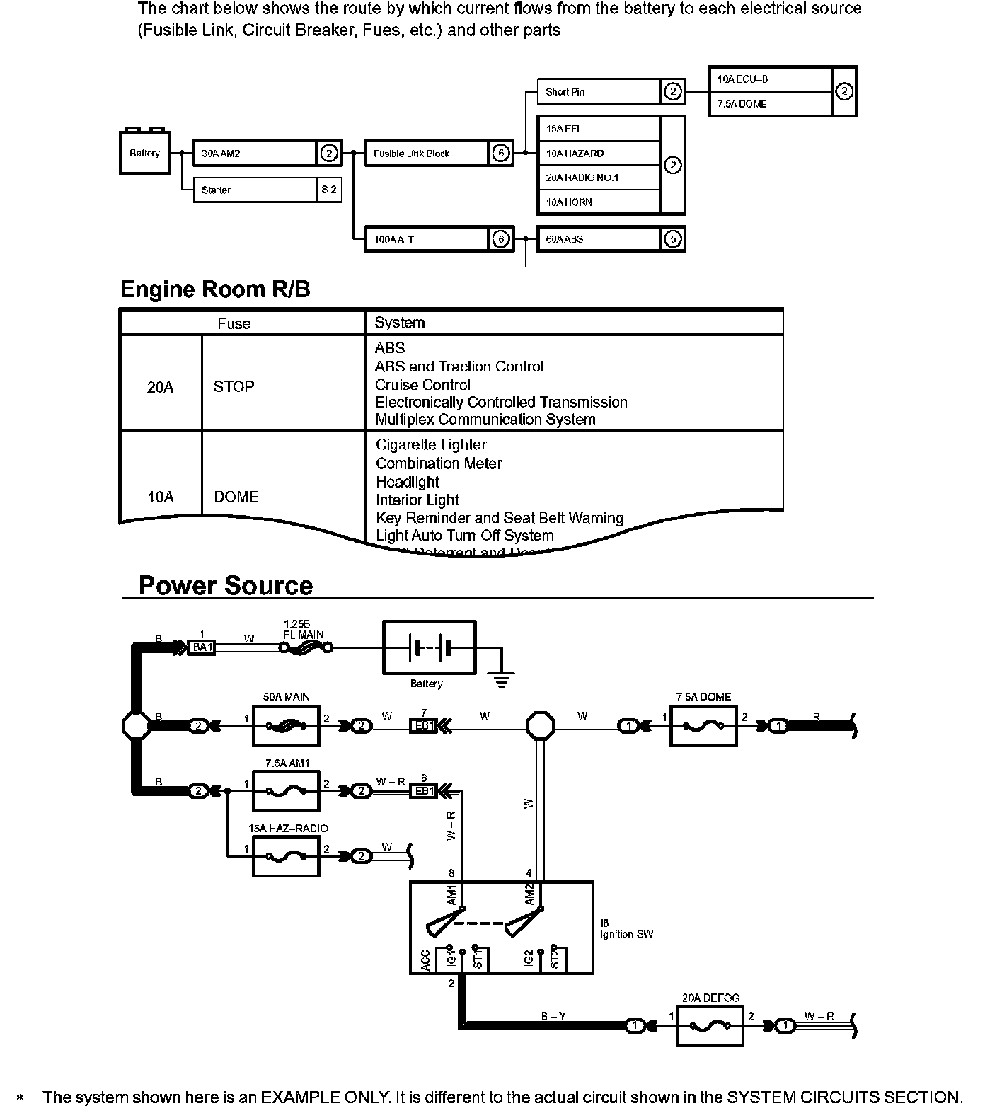 HOW TO READ POWER SOURCEThe "Current Flow Chart" section, describes which parts each power source (fuses, fusible links, and circuit breakers) transmits current to. In the Power Source circuit diagram, the conditions when battery power is supplied to each system are explained. Since all System Circuit diagrams start from the power source, the power source system must be fully understood.