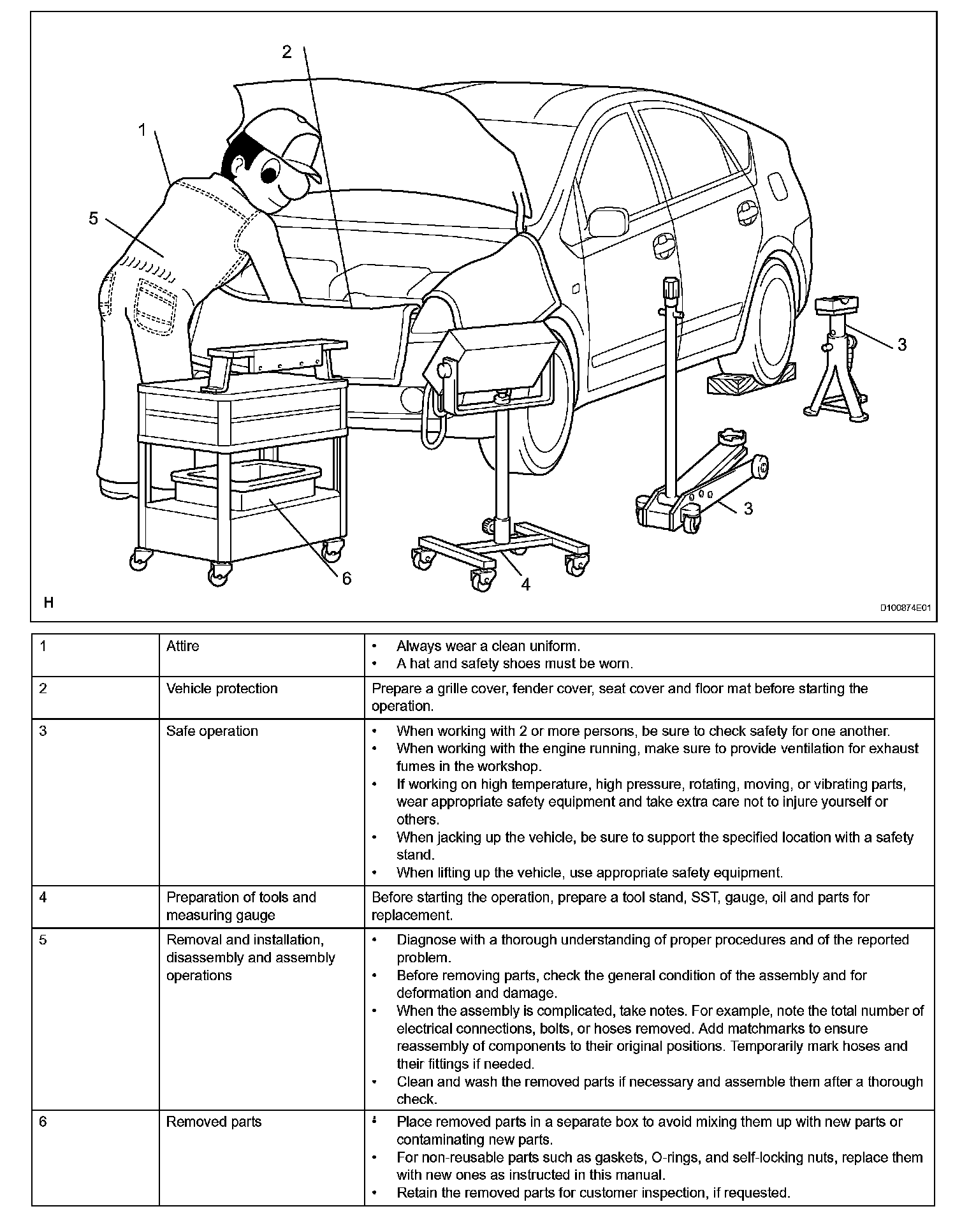 1. Care must be taken when jacking up and supporting the vehicle. Be sure to lift and support the vehicle at the proper locations.