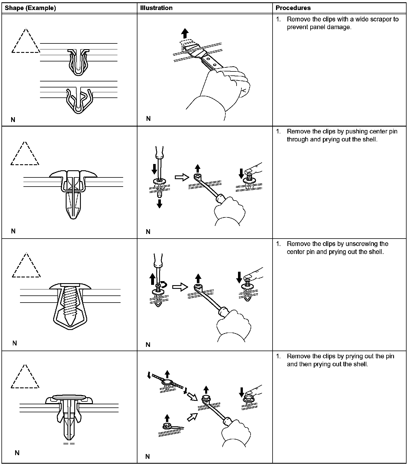 1. The removal and installation methods of typical clips used for vehicle body parts are shown in the table.