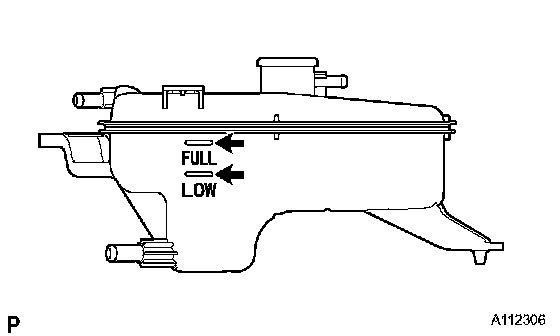 j. Check that the coolant level is between the FULL and LOW line. If the coolant level is below the LOW line, repeat all of the procedures above. If the coolant level is above the FULL line, drain coolant so that the coolant level is between the FULL and LOW line.