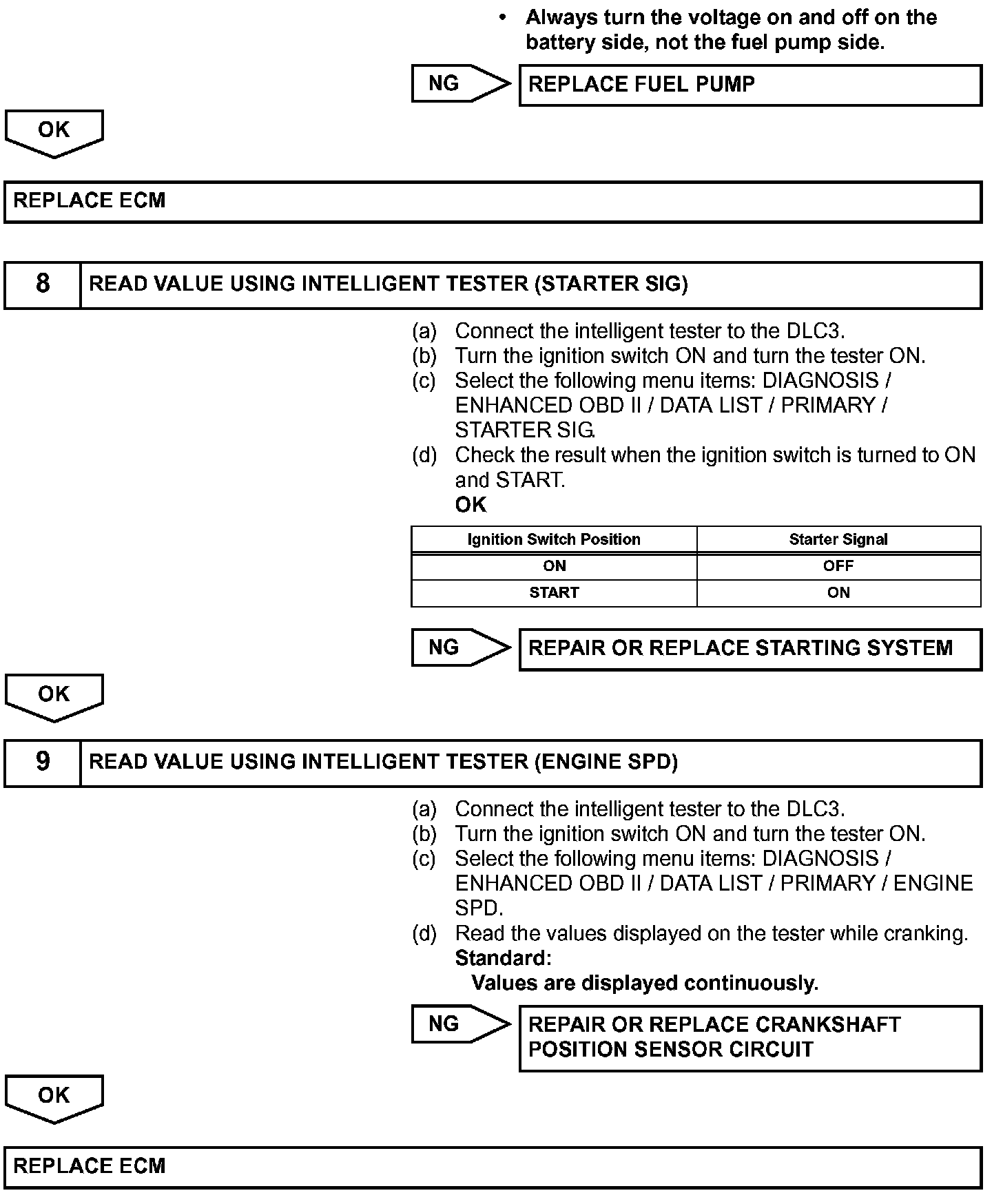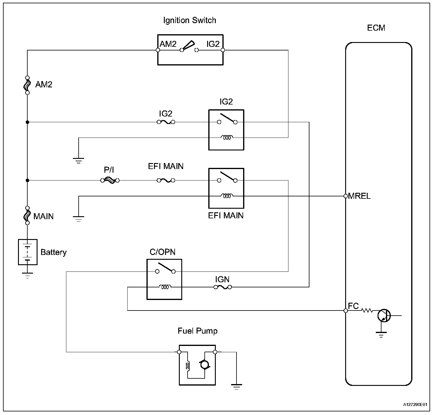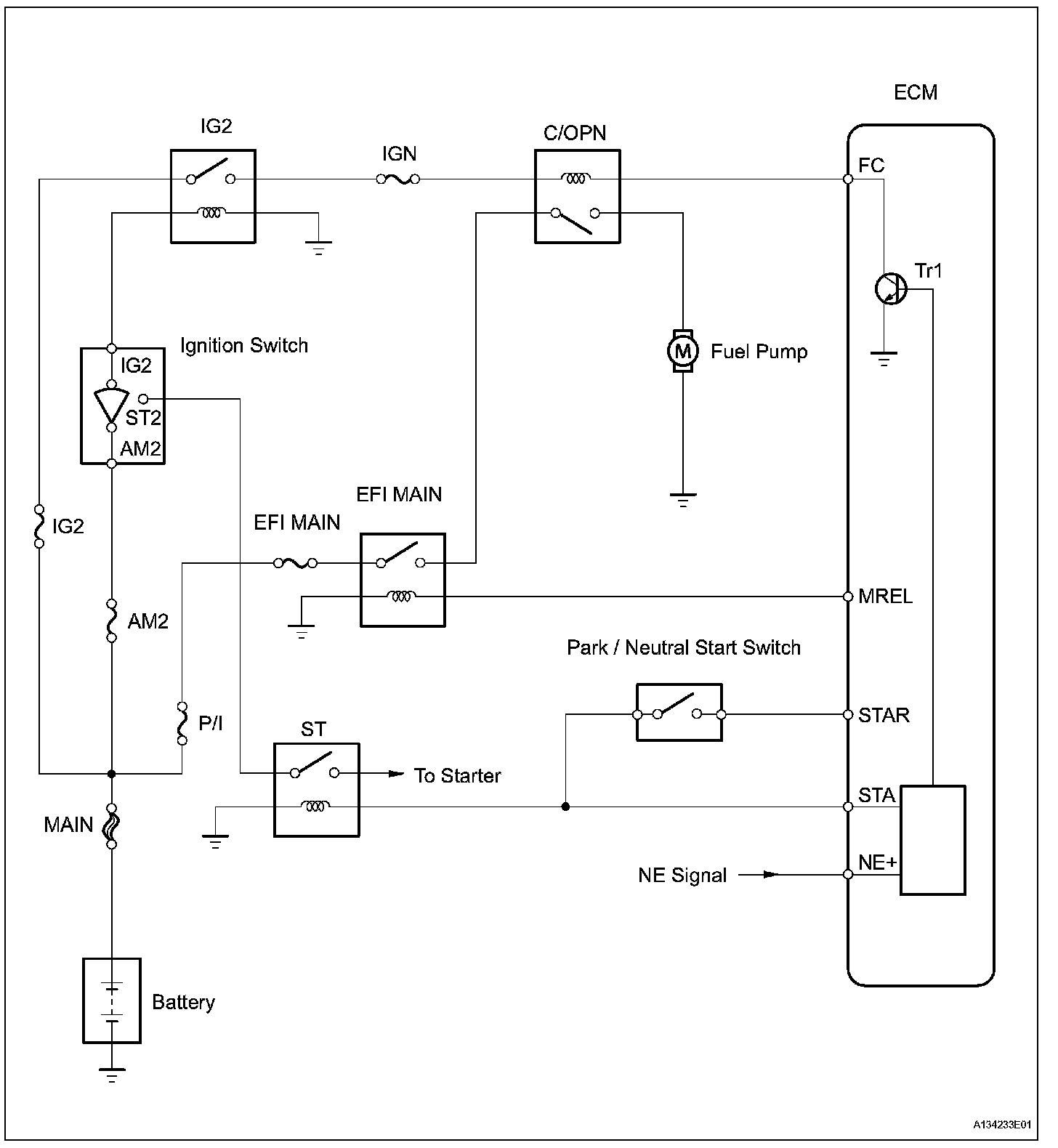 When the engine is cranked, the starter relay drive signal output from the STAR terminal of the ECM is input into the STA terminal of the ECM, and NE signal generated by the crankshaft position sensor is also input into the NE+ terminal. Thus, the ECM interprets that the engine is cranked, and turns the transistor Tr1 in the ECM internal circuit ON. The current flows to the C/OPN (Circuit Opening) relay by turning the Tr1 ON. Then, the fuel pump operates.