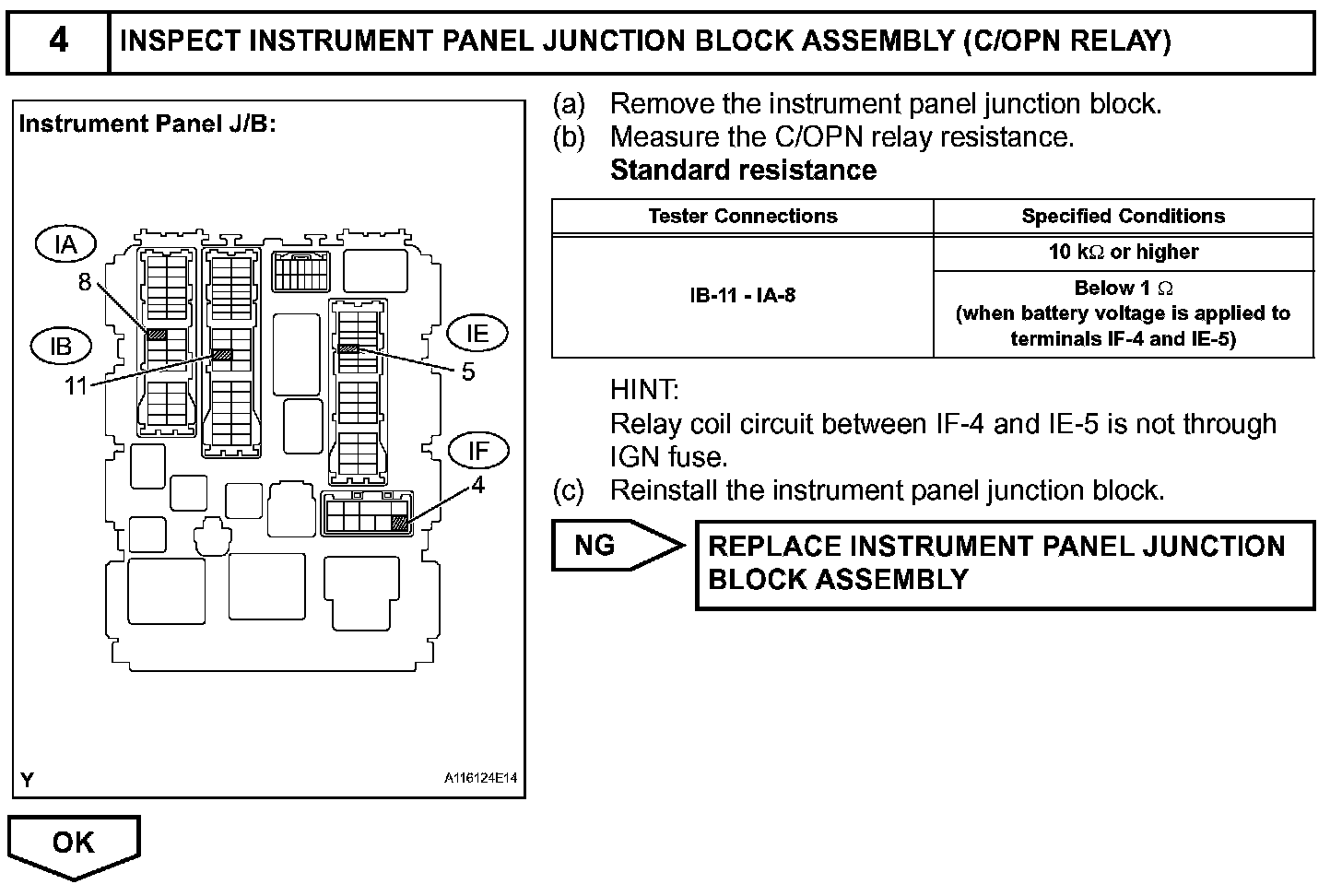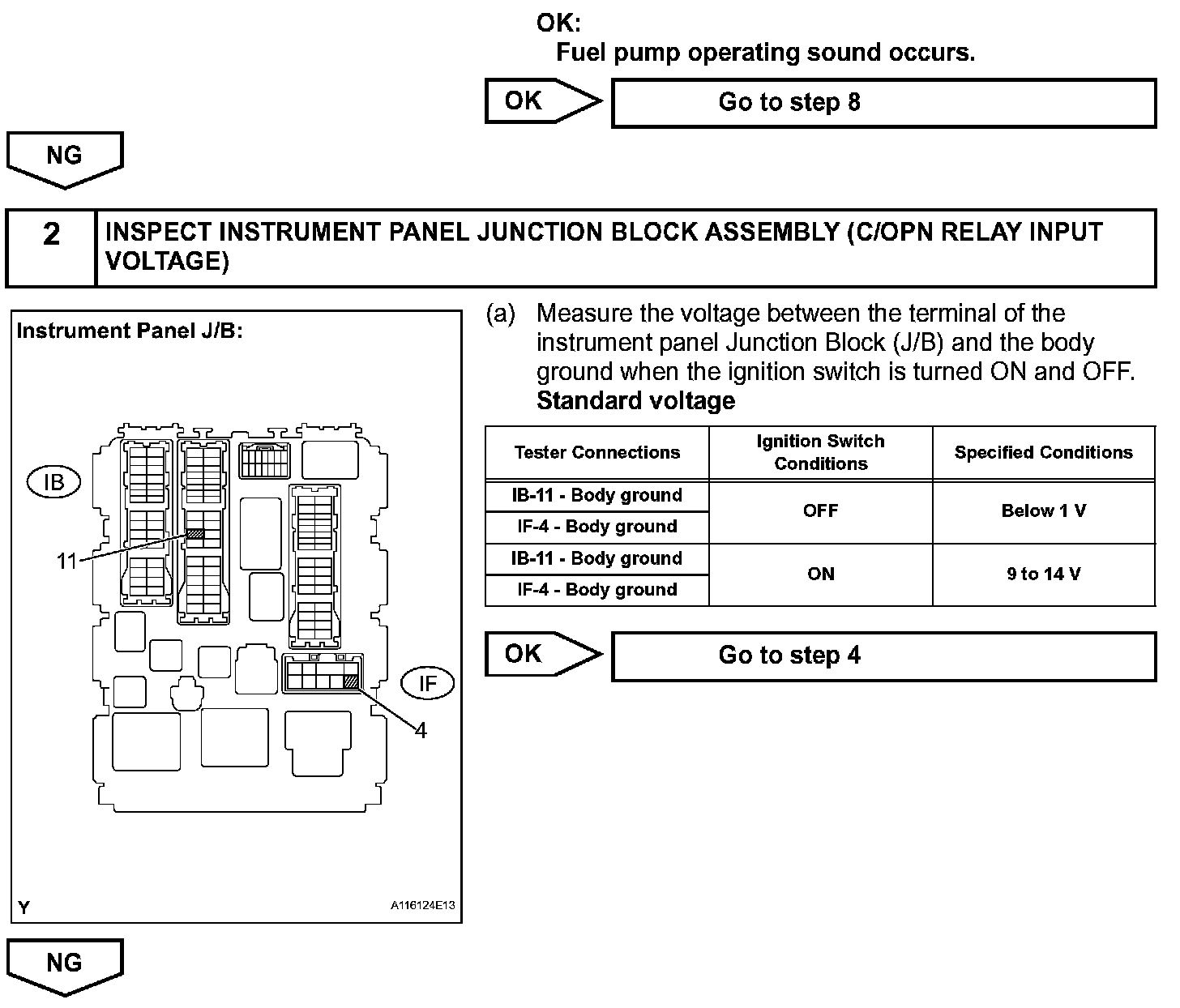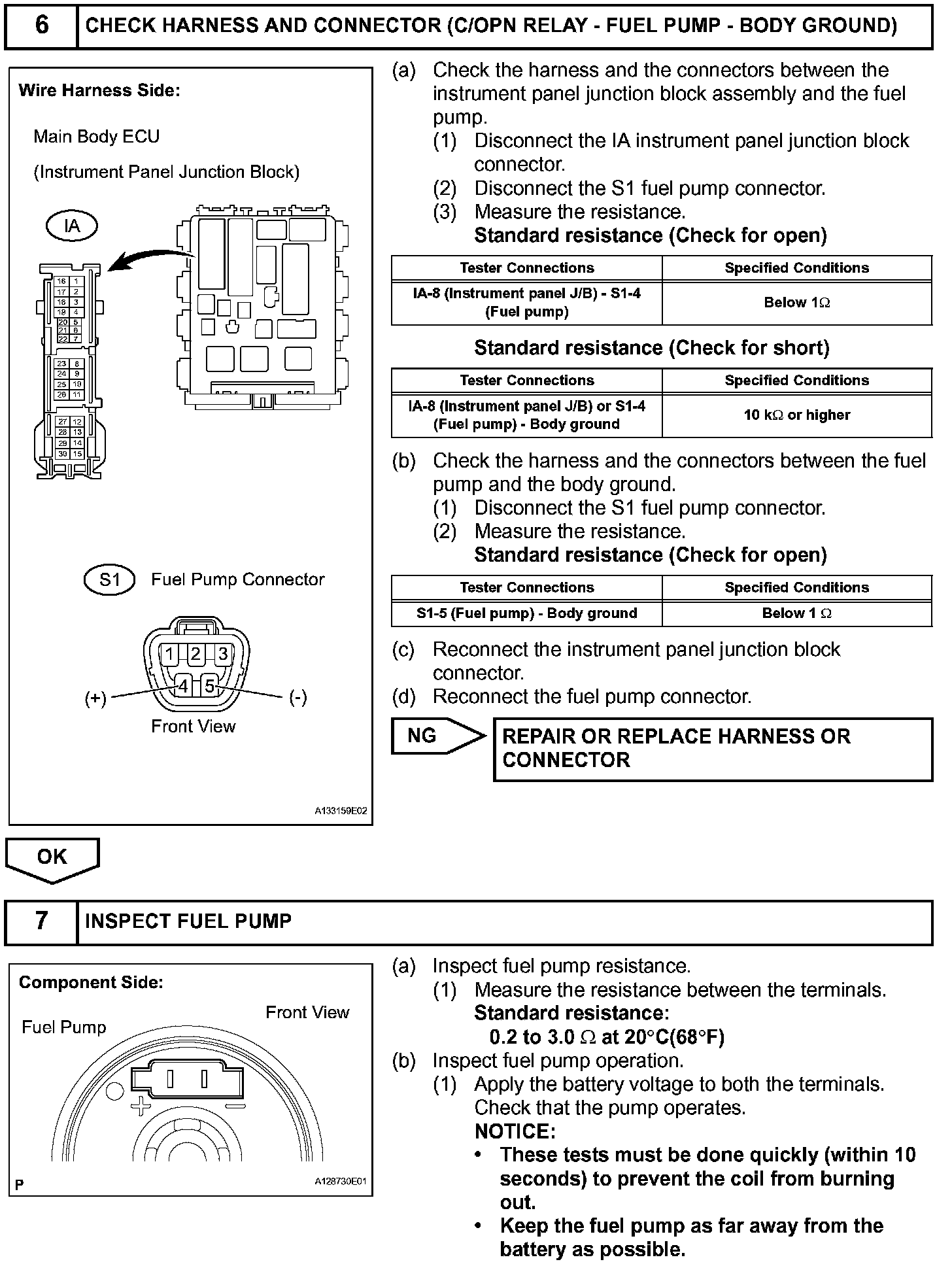 When the engine is cranked, the starter relay drive signal output from the STAR terminal of the ECM is input into the STA terminal of the ECM, and NE signal generated by the crankshaft position sensor is also input into the NE+ terminal. Thus, the ECM interprets that the engine is cranked, and turns the transistor Tr1 in the ECM internal circuit ON. The current flows to the C/OPN (Circuit Opening) relay by turning the Tr1 ON. Then, the fuel pump operates.